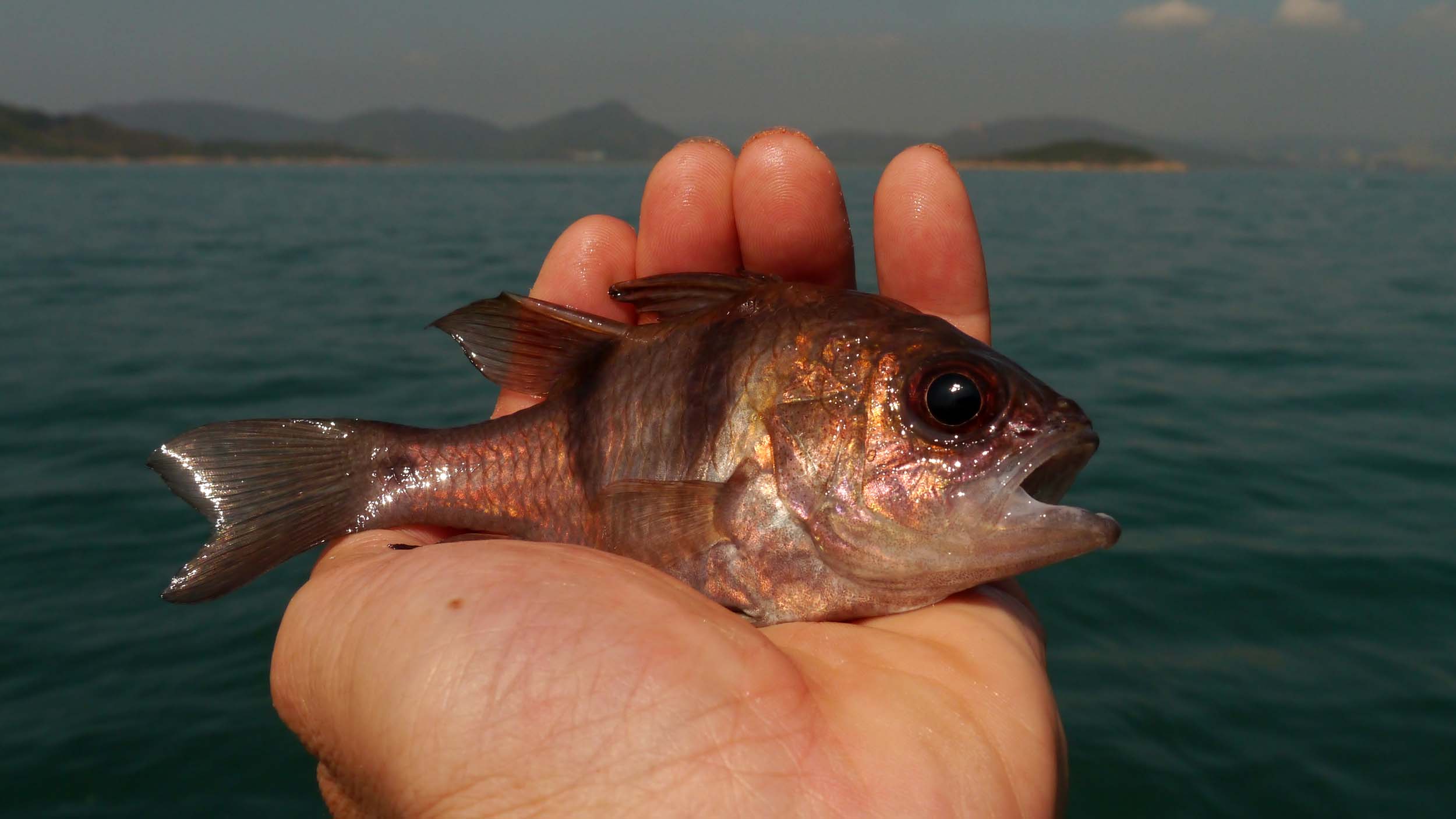 上げ潮では、本流と本流の間を重点的に狙いましたが、30mほど遠投しても反転流に押されて仕掛けは手前へと戻ってきます。3時間くらいは本命のチヌは釣れず、カサゴ・ナマコ・歯のあるコノシロの仲間・ヨコスジイシモチのみ。