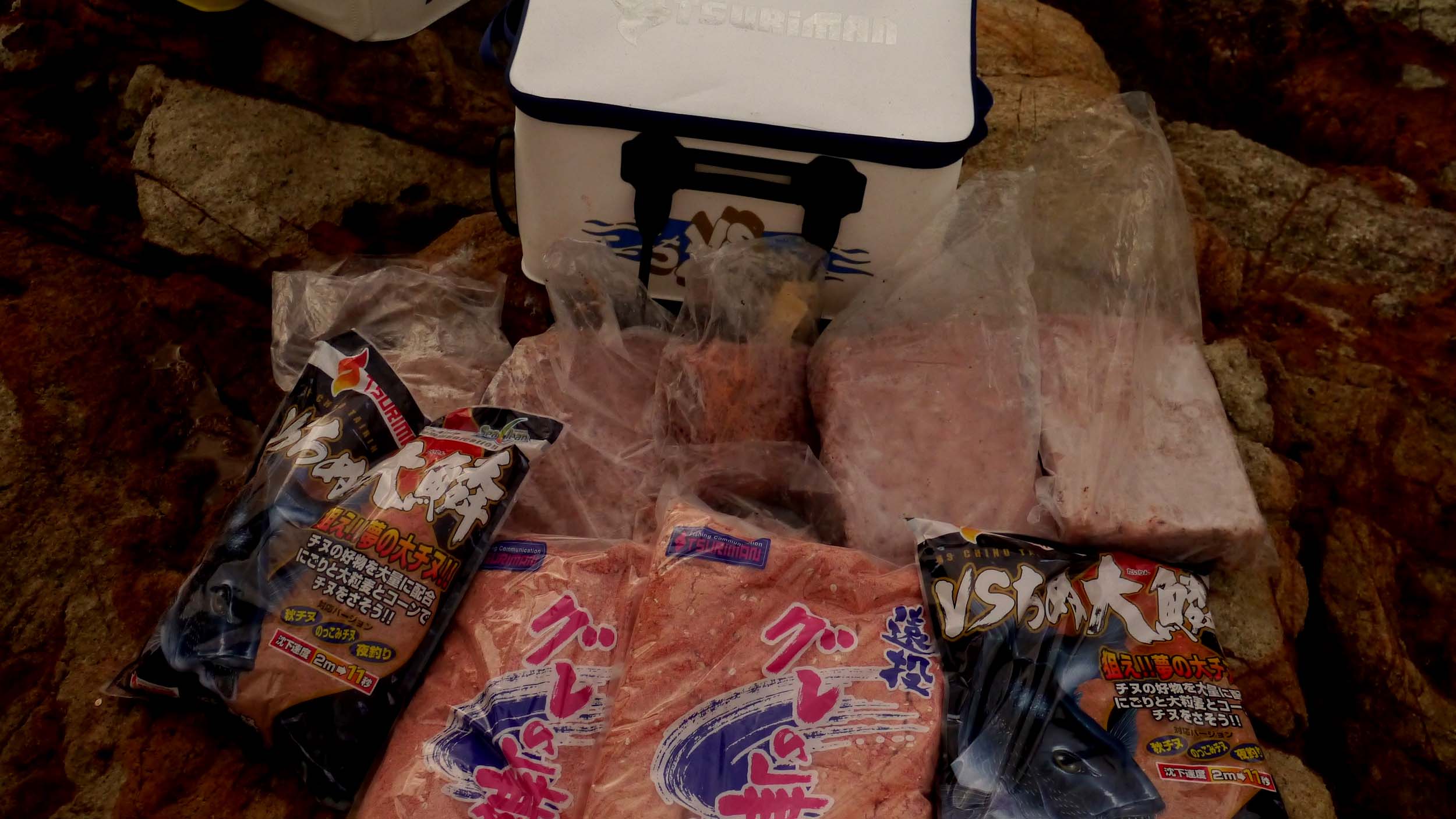 噂のアイゴの子供がかなり群れている様で、一投毎に本命を狙うとオキアミの生では直ぐにエサを取られてしまいます。よって、磯際から10m位までエサ取りを集め、10分に一度だけ30m沖にマキエを打って狙うと、比較的サシエが通ります。でもチヌの反応は出ないのです。