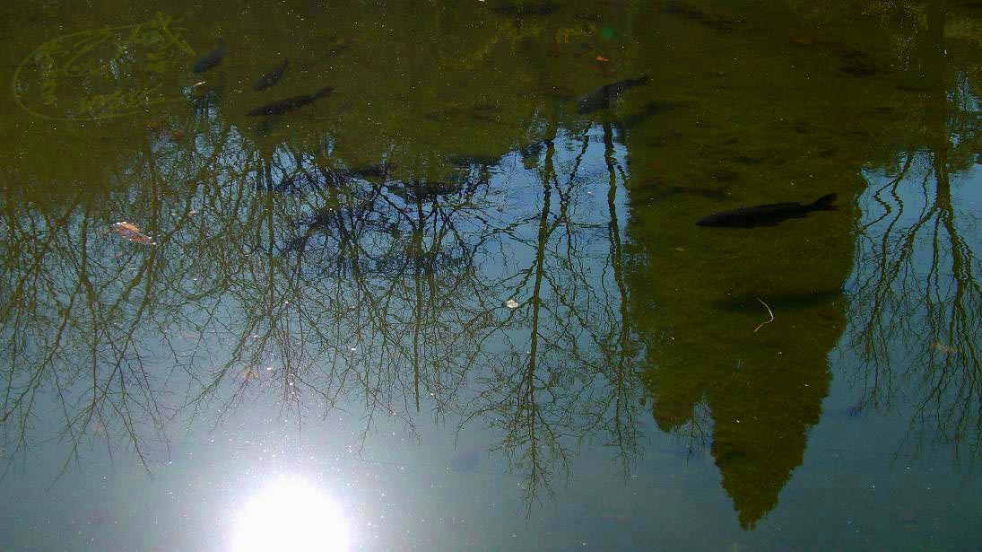 池に写っている絵を撮っていたら、丁度コイが泳いできた。別に呼んだ訳ではないけど、写りたいらしい。