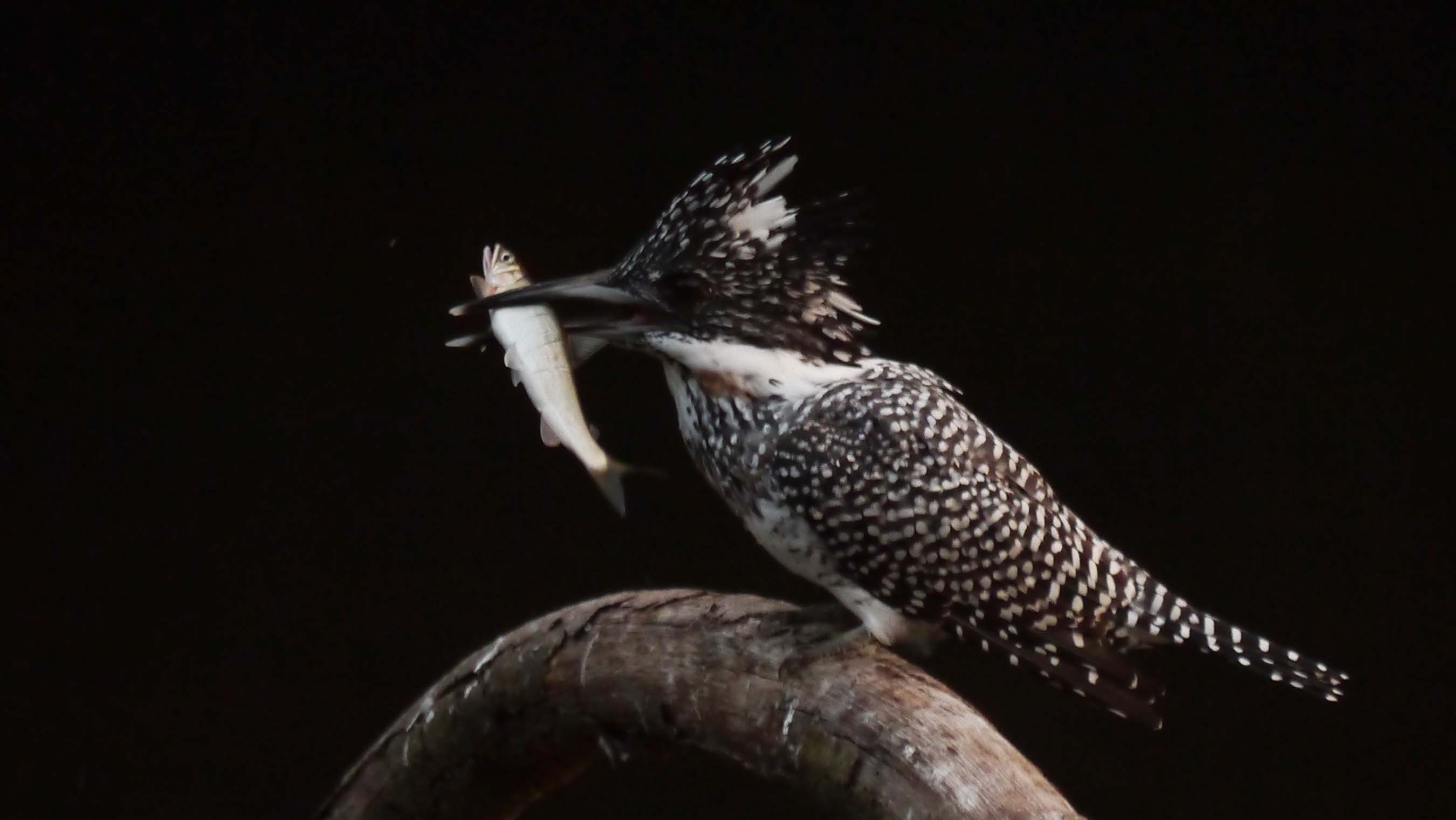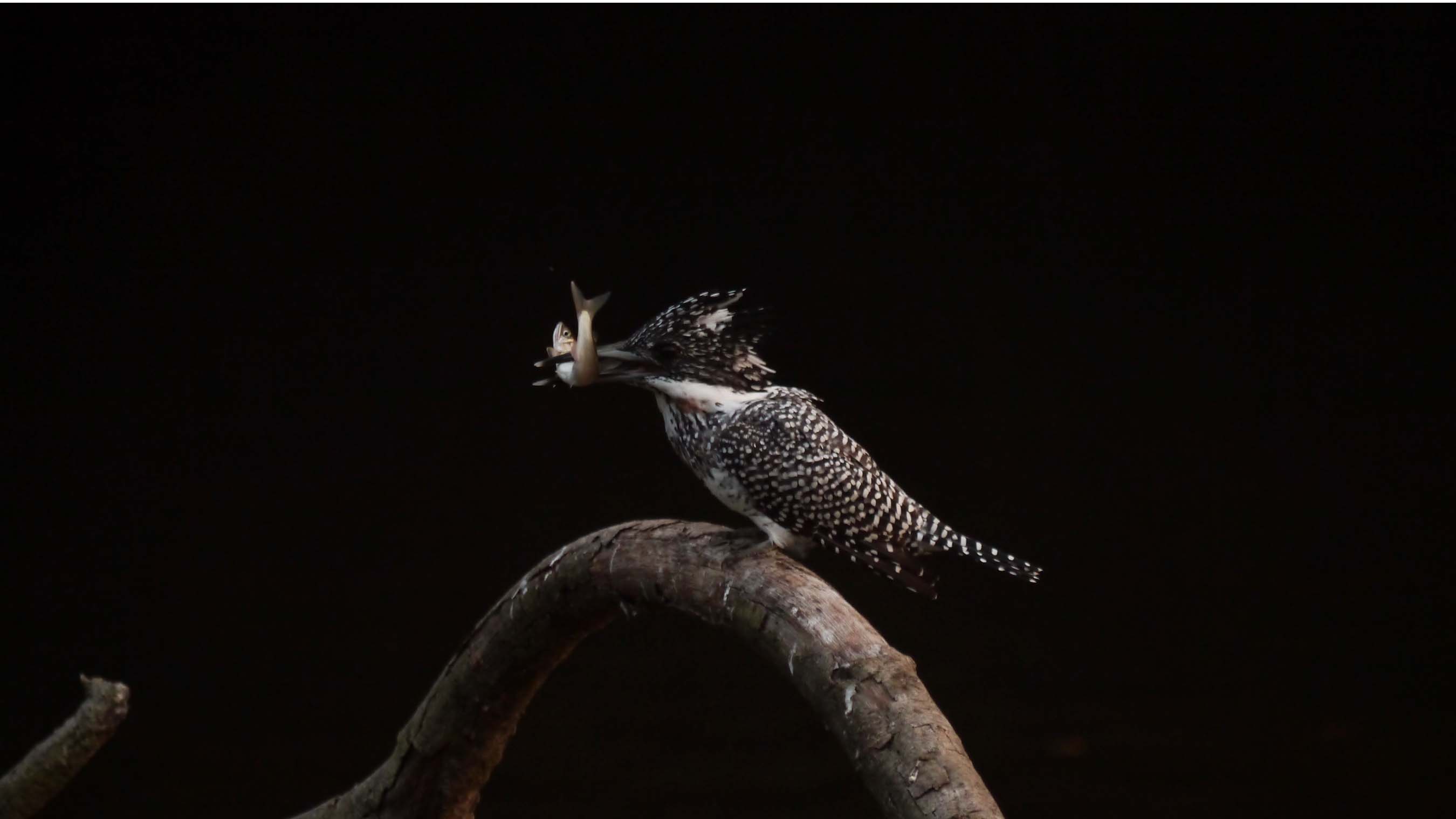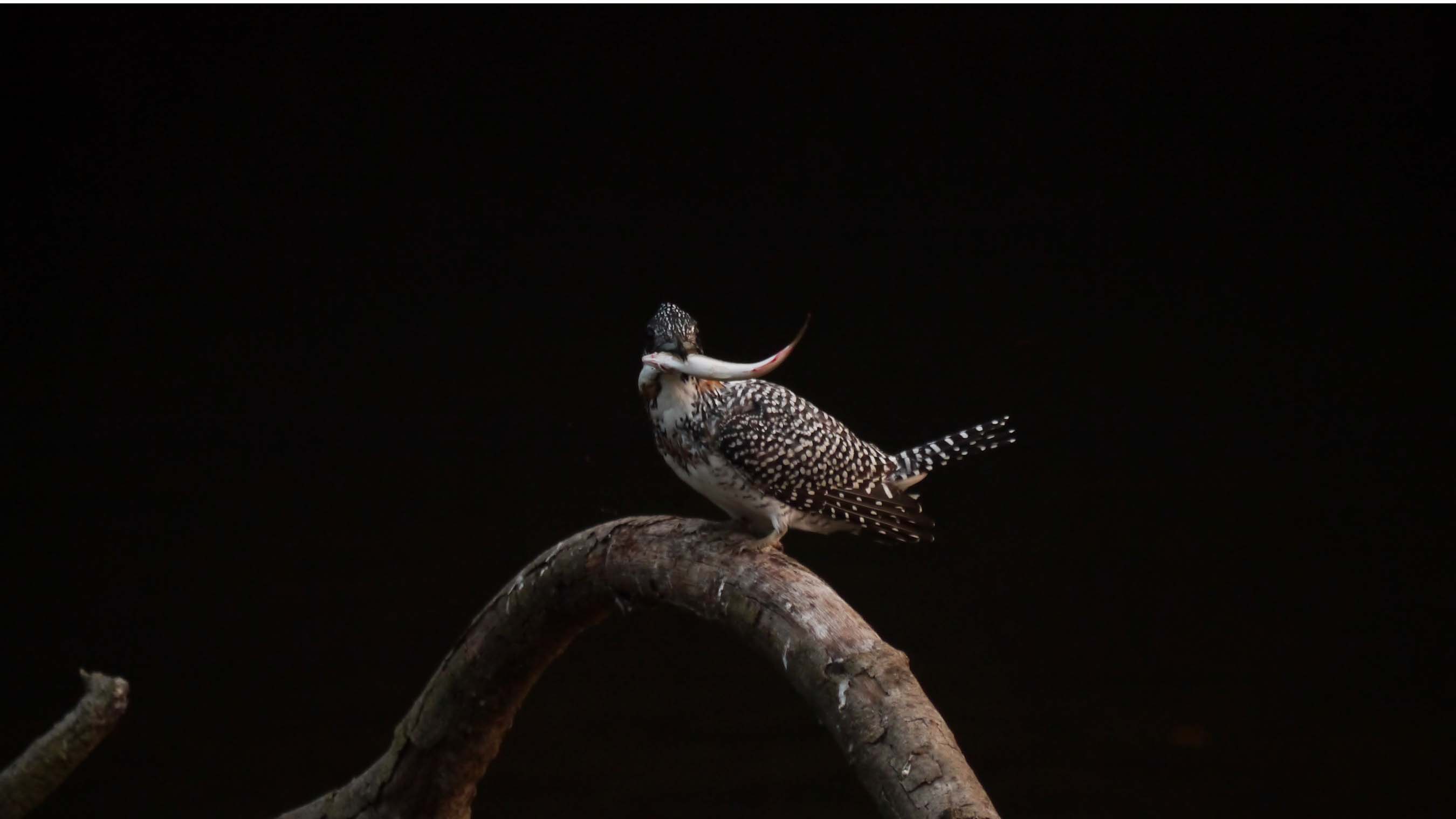 しかしながら、この後咥えているアユを見つけた子供のヤマセミ?が、エサをねだりに飛来。それを察知したお父さんは、素早くレストランから飛び去り、アユの食事風景と食後の水浴びは露と消えたのです。子供は親からエサを貰えなくなっている時期ですね。