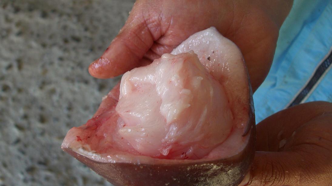 皮の内側にゼラチン質の肉、そして脂肪が中に詰まっている。