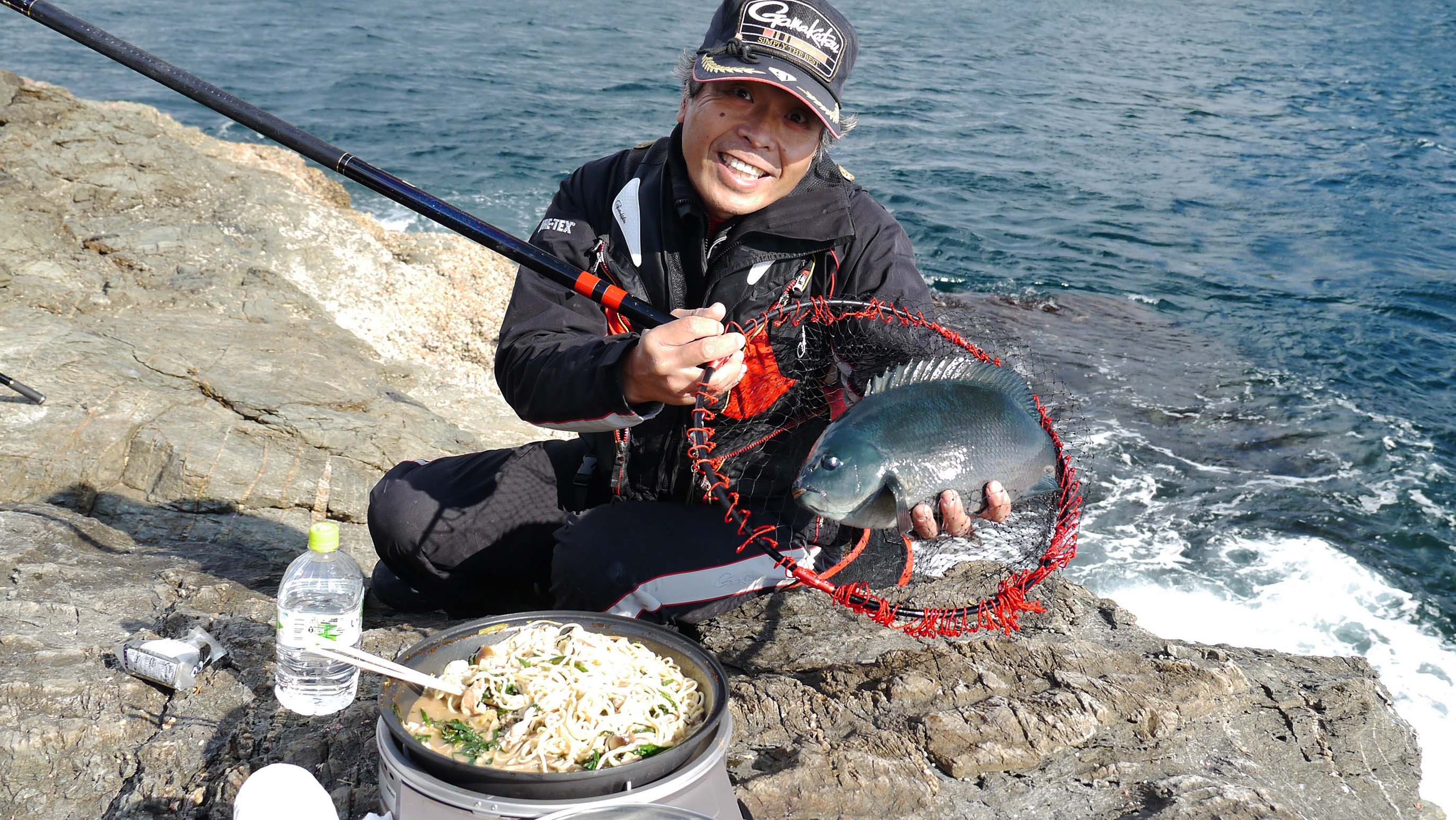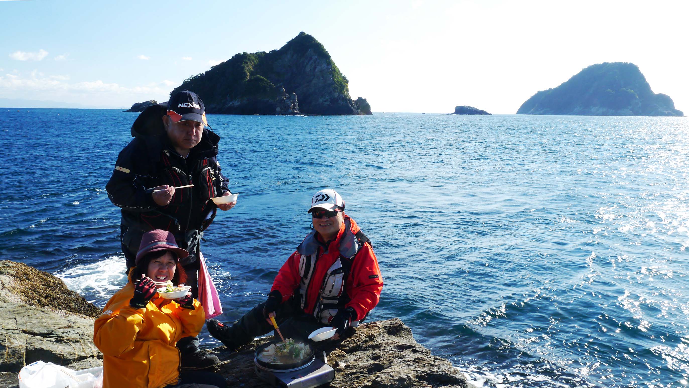 潮止まりにみんなでモツ鍋。その後は西側から下げ潮を狙っての釣りです。前日の潮とは違って力強い流れが磯をかすめているので、ガン玉を多めに打っての対応。その仕掛けにレギュラーサイズのグレや、久し振りのイサキなどがコンスタントに竿を曲げます。