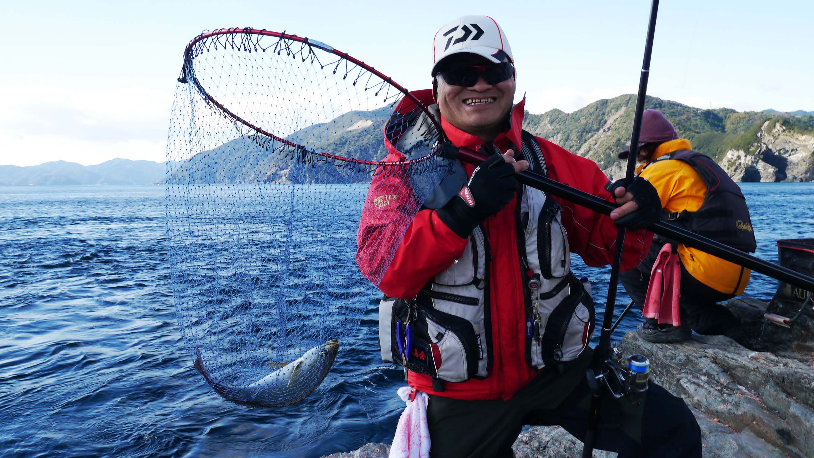 12時過ぎの潮止まり前から、14時過ぎの満ち込みに至る時間だけ私も竿を振りました。食事をした場所から南に向け、左右から潮が舞い込んでいるポイントへ40m前後の大遠投。微笑んでくれたのは40㎝オーバーのグレなど納得の釣果でした。