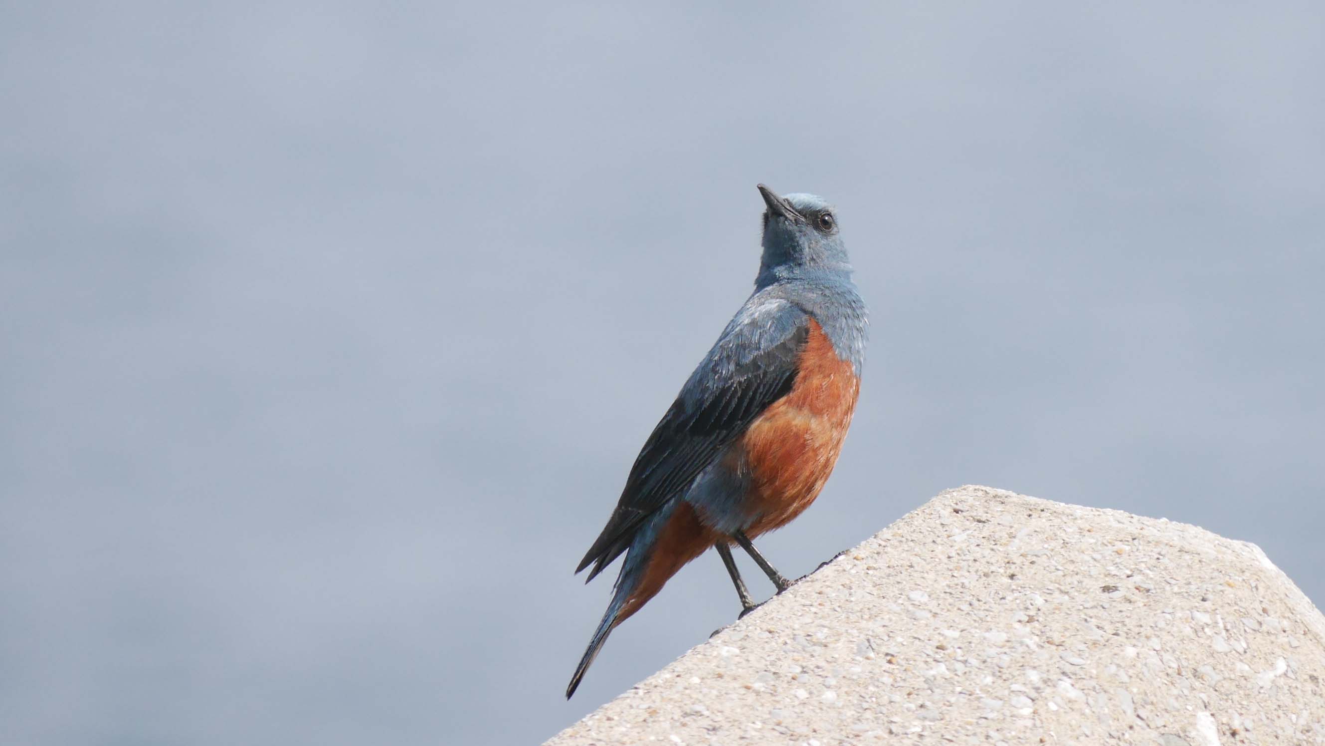 その下の海岸で、ハヤブサの動きを警戒するイソヒヨドリ
