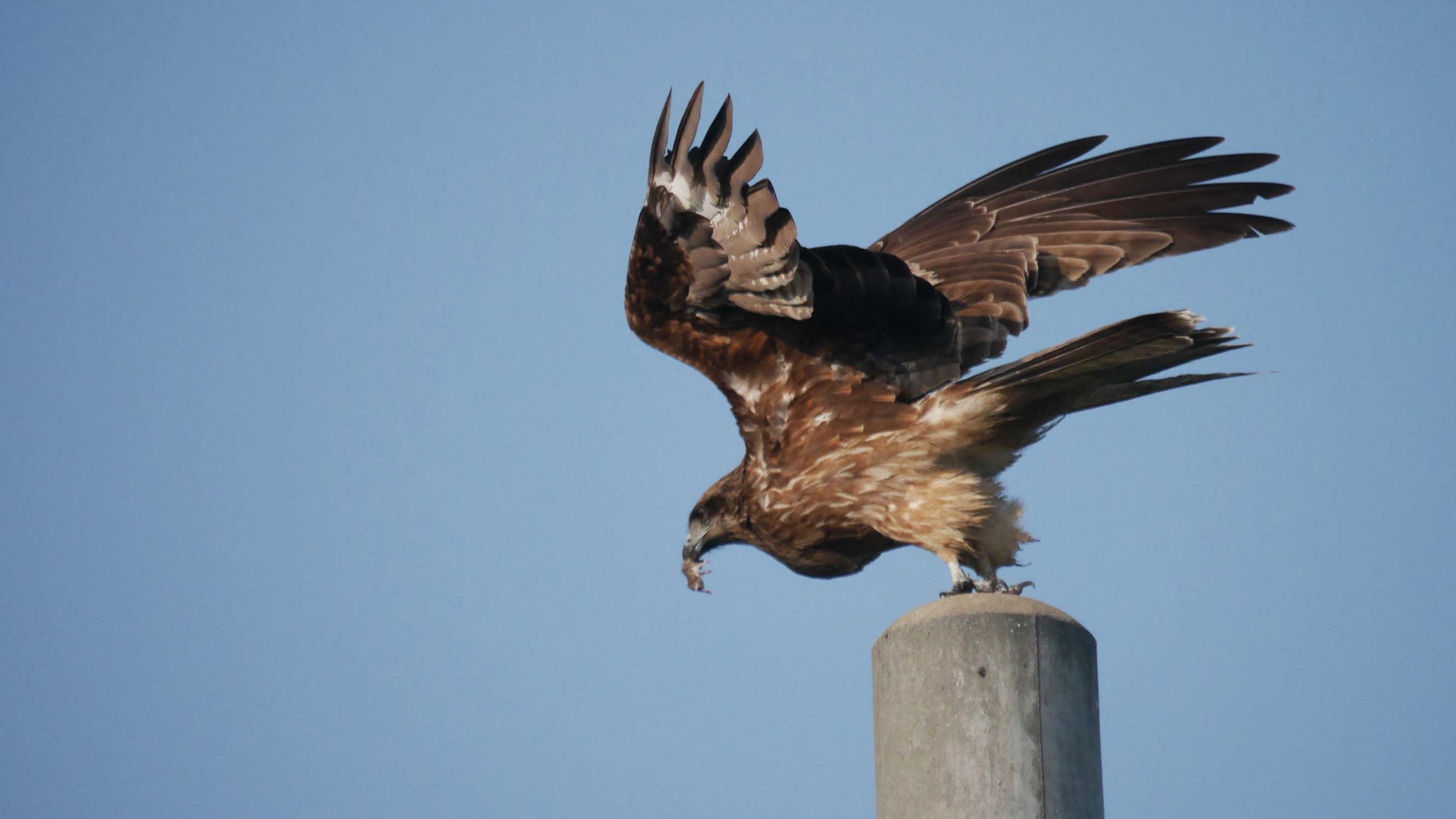 みつけ海岸でネズミを捕らえたトビ