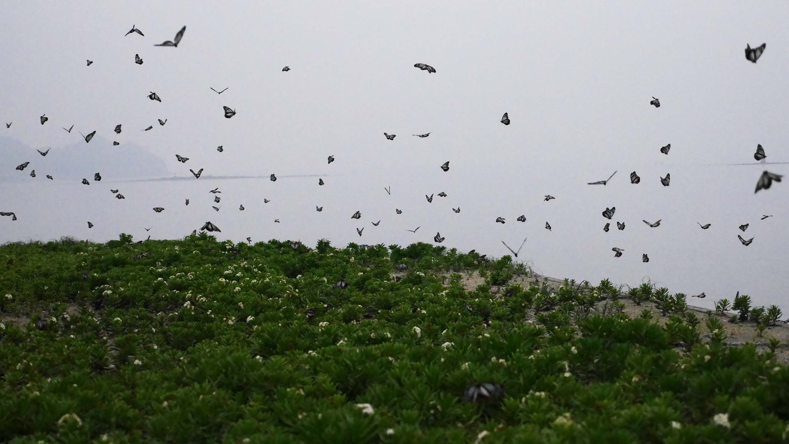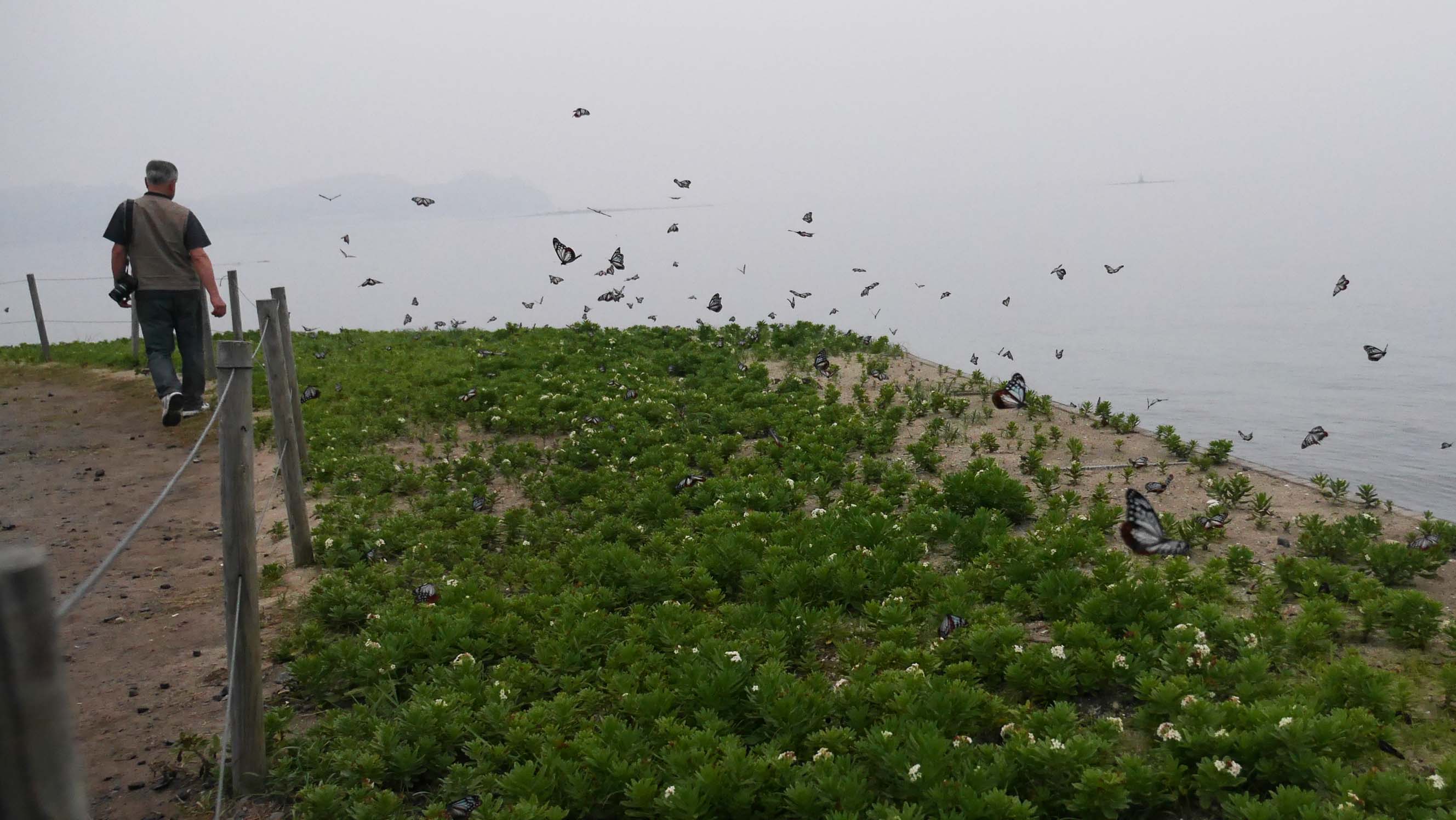 天気は晴れですが姫島は濃い霧に包まれていて、太陽が顔を出してくれません。アサギマダラは次々に増えて100頭以上になるのに時間は要しません。でも地元の方も早く見えて5時15分、続いて5時31分と更に40分頃、これでは野鳥の撮影は困難と判断し、今回の捕食撮影は終了しました。その後7時過ぎまで乱舞するアサギマダラを撮影し、次の目的にしていたミサゴ撮影に向かったのです。