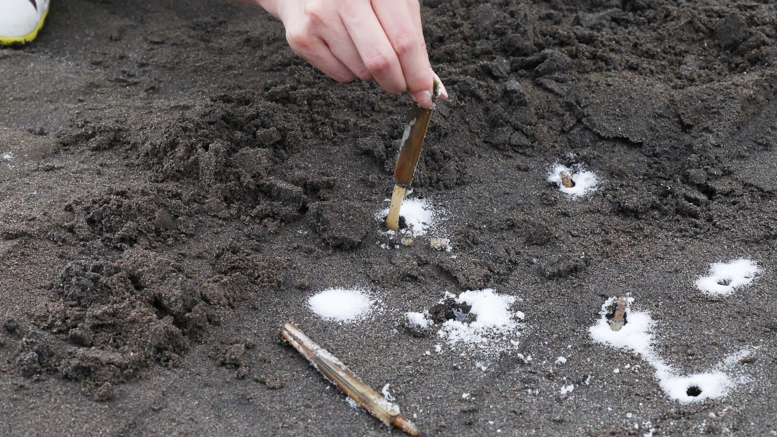 アサリと違ってマテガイは、海浜公園が開いている9月一杯まで掘れますよ。