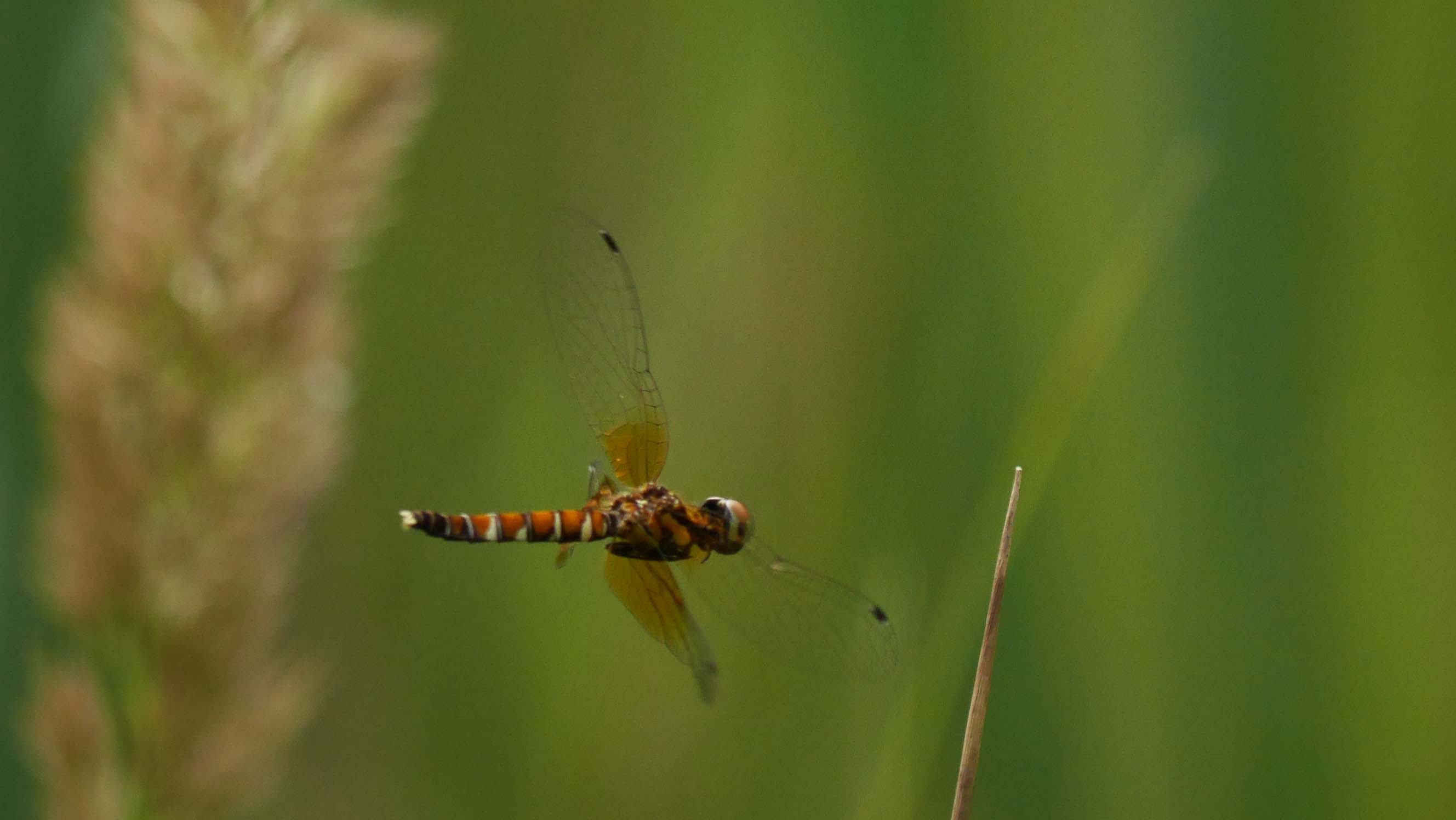 飛びものにもチャレンジできるお天気なのに居てくれないの?・・・少しへこんで進むとトンボ池は直ぐに見つかりました。湿地の中の歩道を通ってあぜ道に出ます。人が通った跡を右折、直ぐに左に折れるとラッキーにもメスが2匹見つかり撮影です。