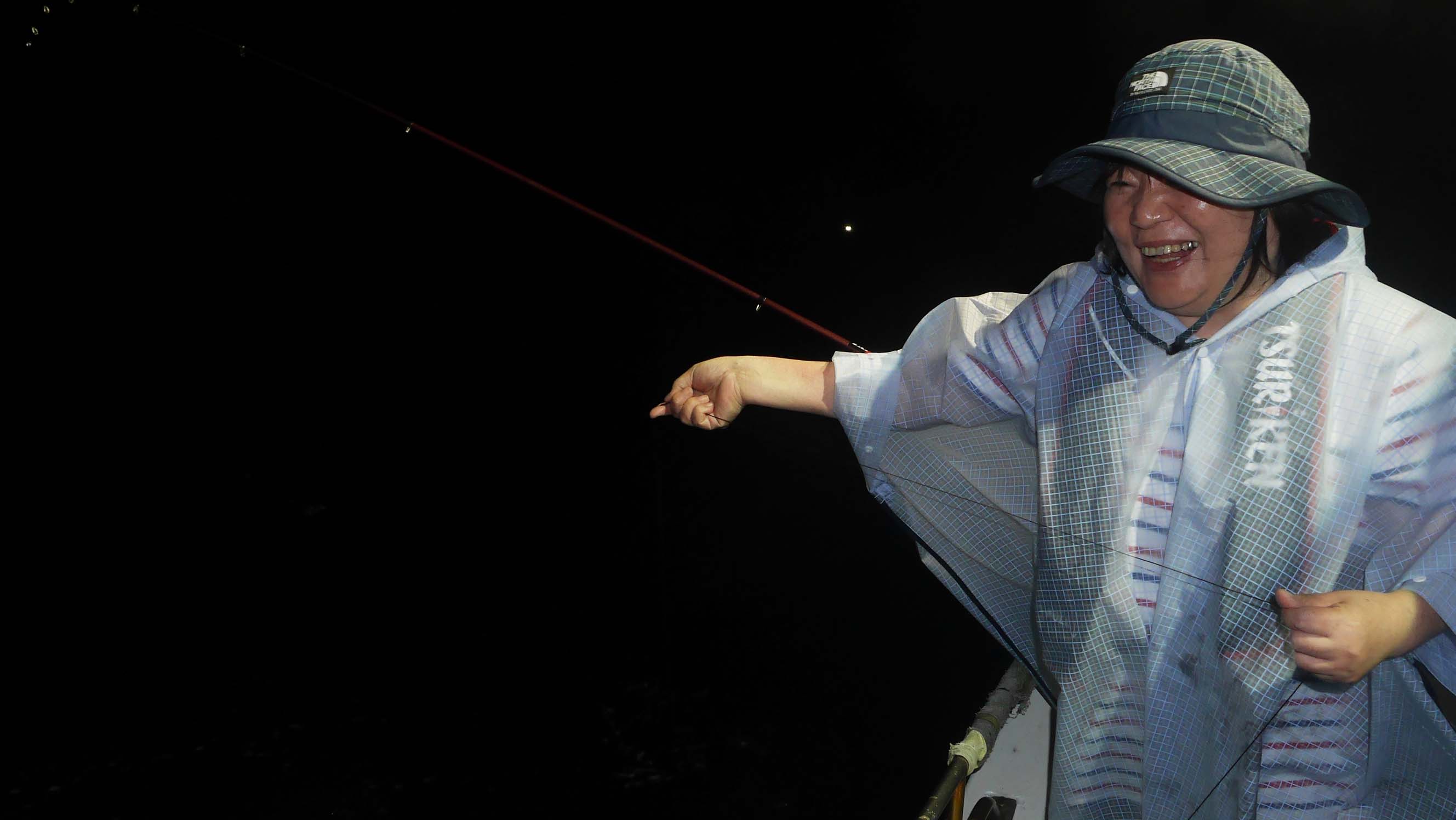 雨は釣り場へ向かう時から私たちを追いかけて、21時ごろまでかなり降り続け、一旦は止んだのですが、22時頃にも断続的に強く降りました。でも私は“がまかつのレインスーツ、GM‐3379”で快適に釣り続ける事が出来て濡れ蒸れなし。