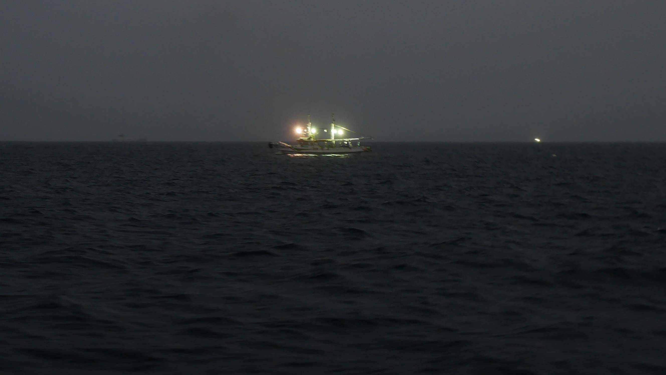 イカ釣り漁船が点在、大型船は縫うように航行します