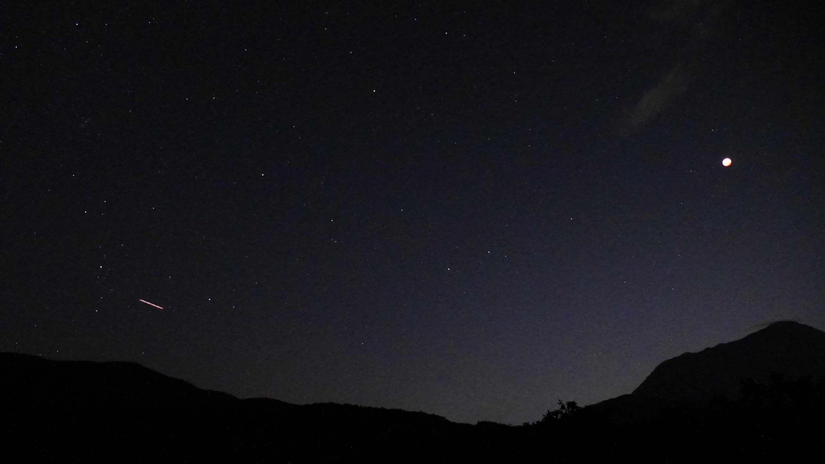 19時47分皆既月食中、星・由布岳・飛行機と
