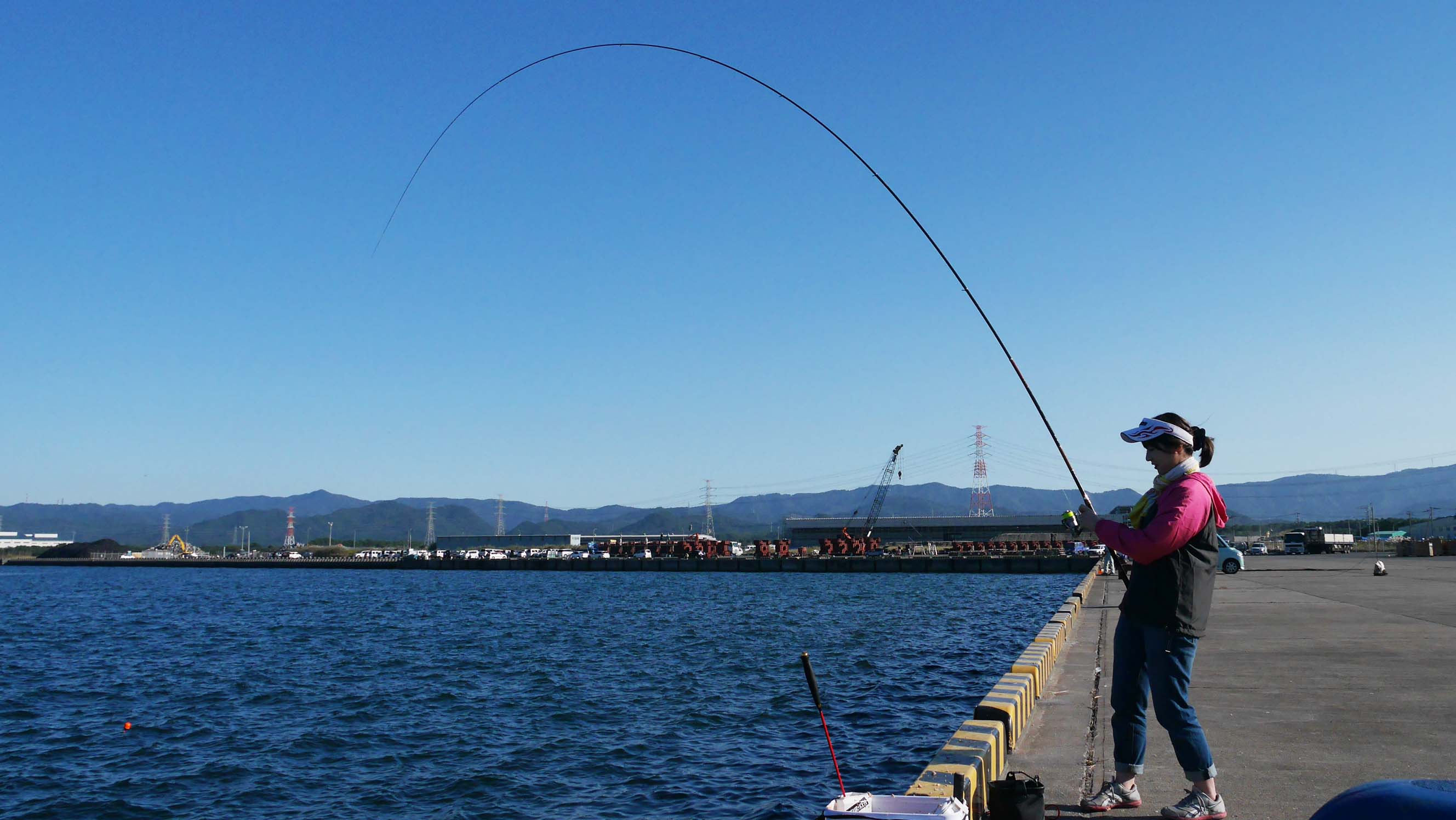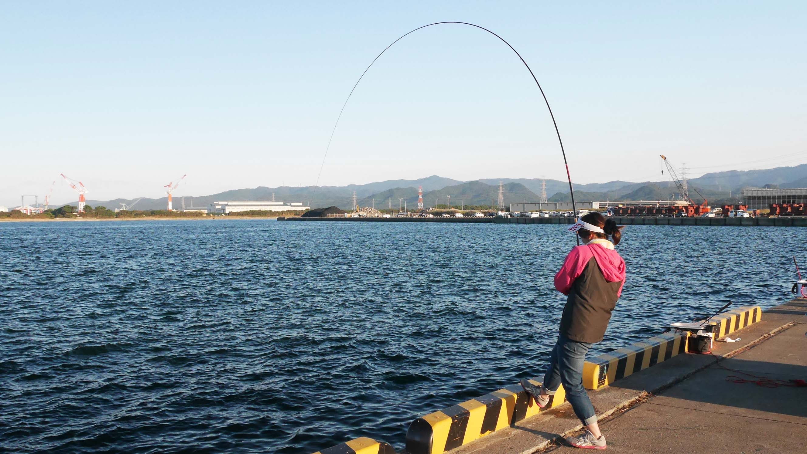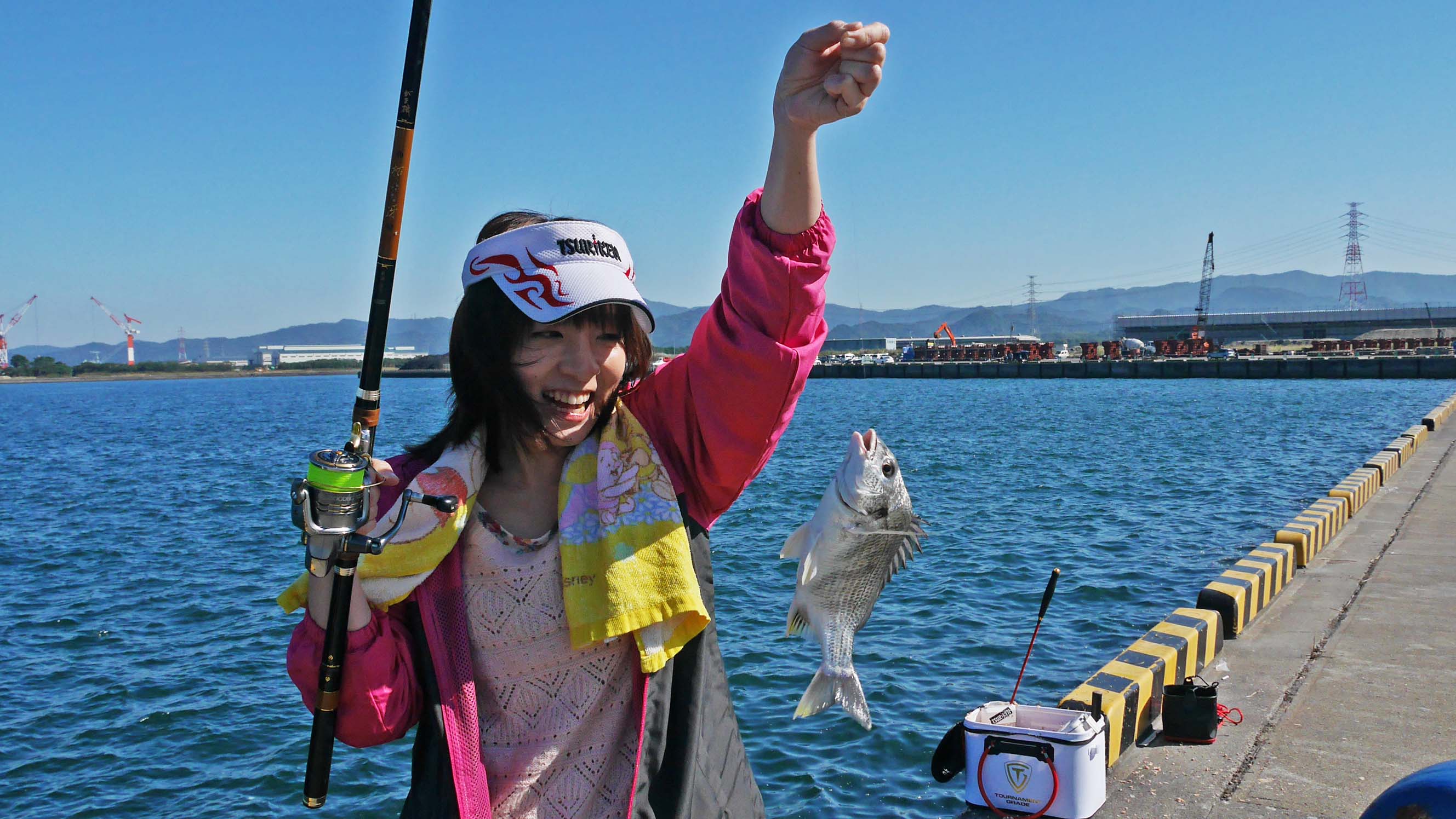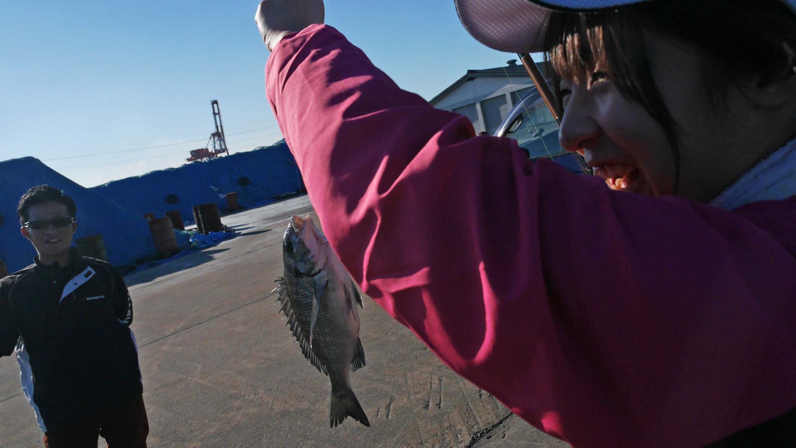 重くて強烈な走りが手元に伝わってきます。その竿を由香里ちゃんにバトンタッチです。ワーワー騒ぎながら巻いたり糸を引き出されたり数分の格闘です。初めての釣りで第一号がいきなり50㎝‼?大きなチヌが海面を割って姿を現したのです。