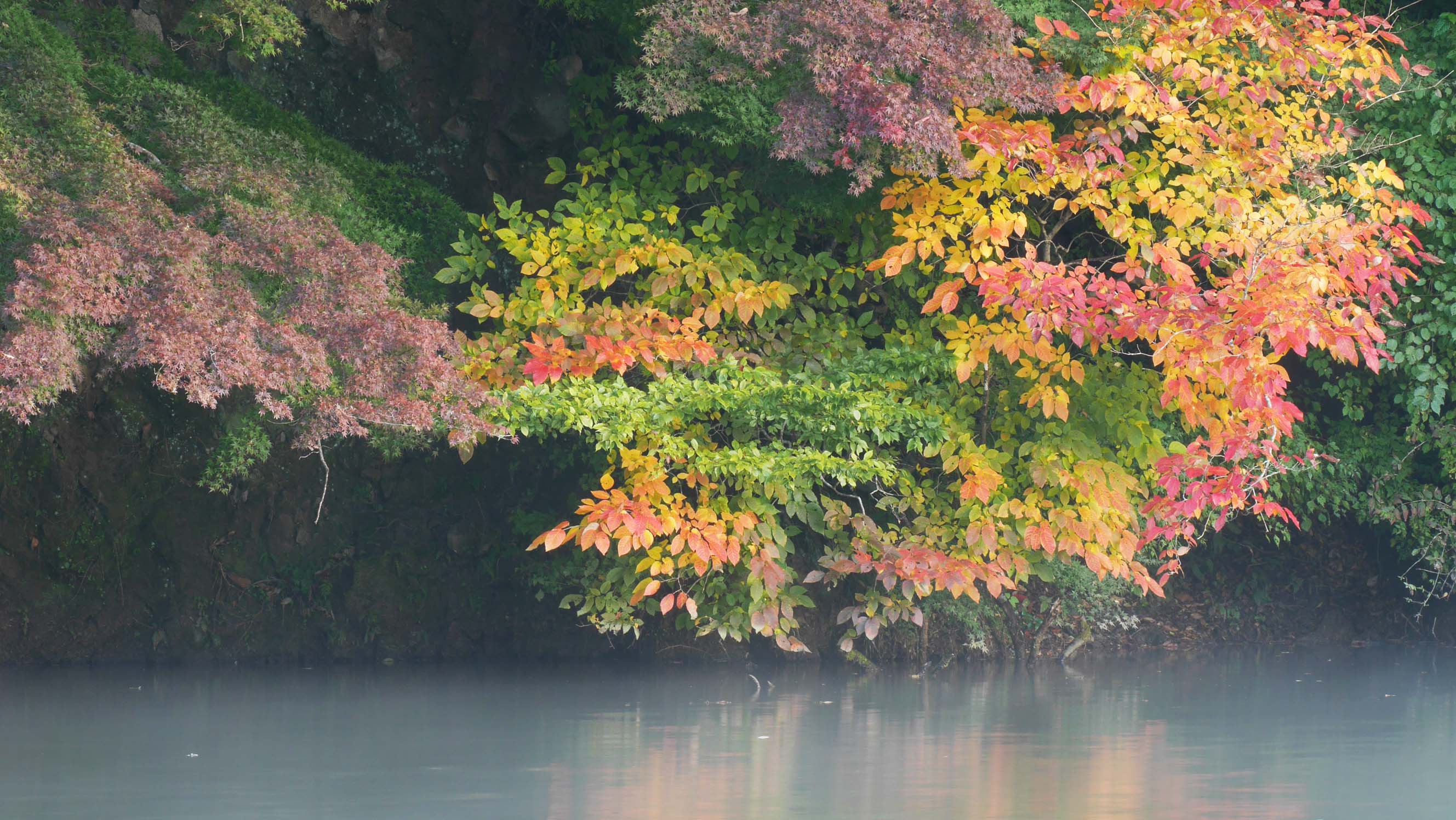 その紅葉の写せるダムの岸辺から