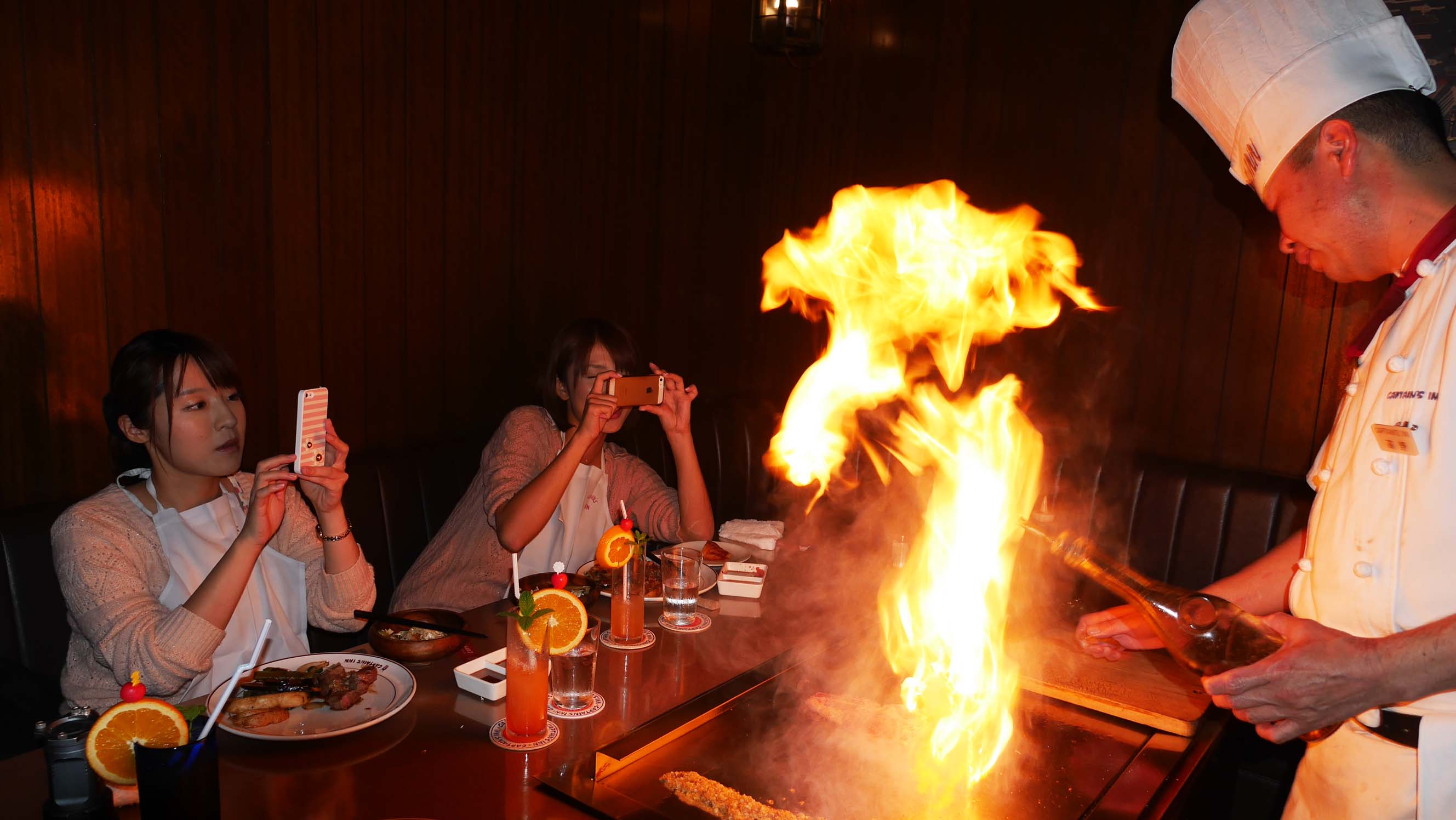 この店は大分県でも珍しい、シェフがお客さんのソファーテーブルで色んなパフォーマンスをしながら、お肉などを順次焼いてくれるのが売りになっいています。今回も有難い事に、オーナーシェフが丁寧に担当してくれたので抜群の間合いで食が進みました。