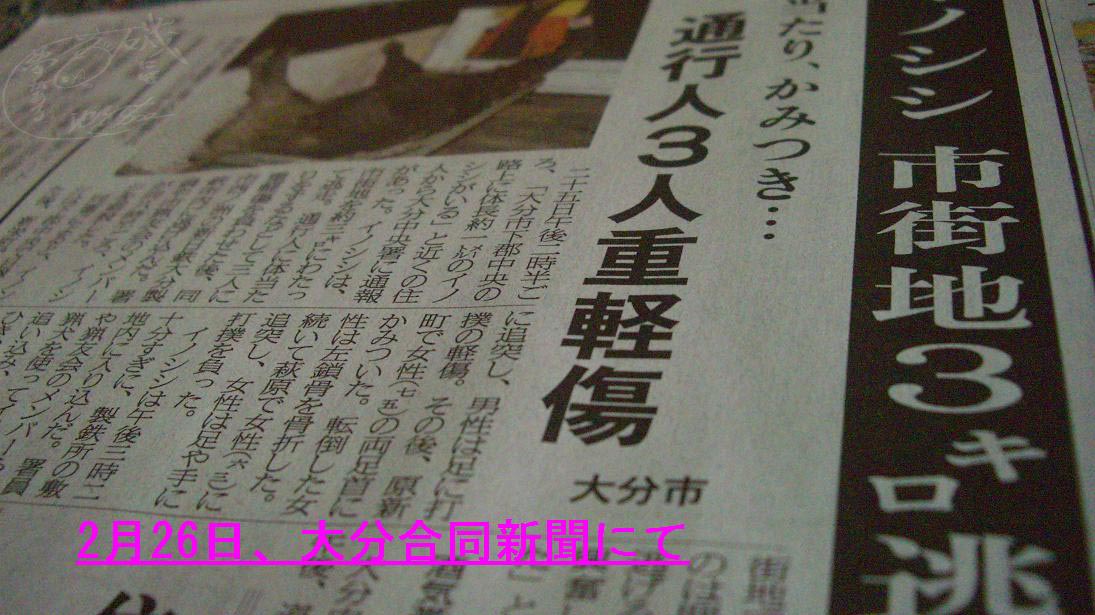 25日の大分市での出来事、小学校付近にイノシシが出て、警察に追われ3kmほど離れた新日鐵大分製鉄所構内に逃げ込み、駆けつけた猟友会の手によって仕留められた。