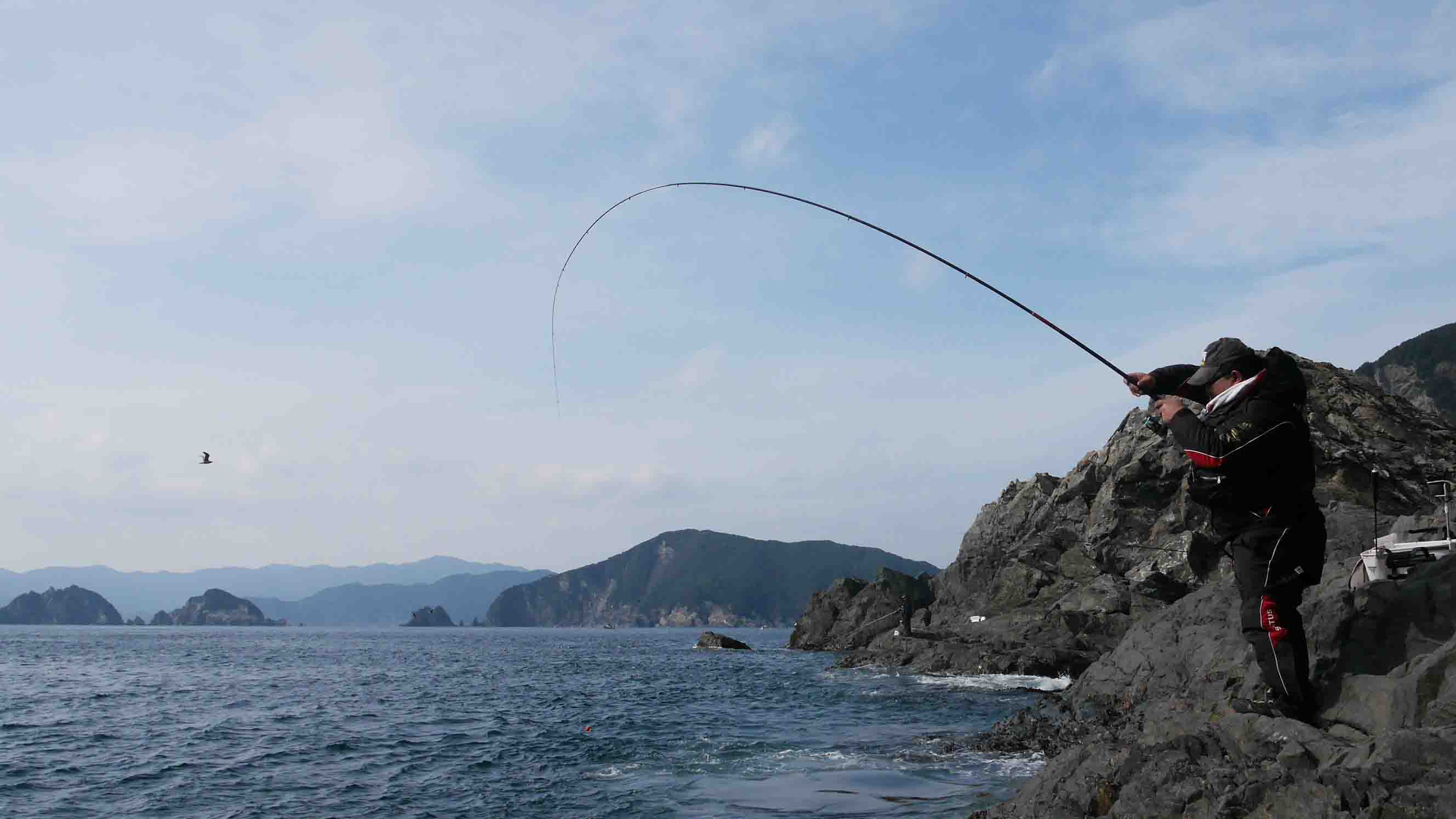 船長の好意で上がった磯は、前渡礁者2名が瀬替わりするという“白浜の中”でした。場所が広いので4人で上り、私は一番奥のポイントで竿を振りました。潮の流れは前方の“サズリ”方向からかなり強く当てており、前渡礁者が瀬替わりする理由が分りました。