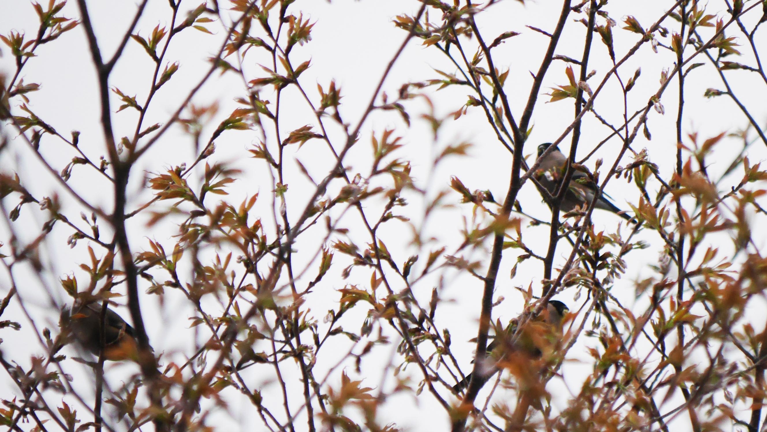今朝の山桜とウソのメス達(冬鳥)