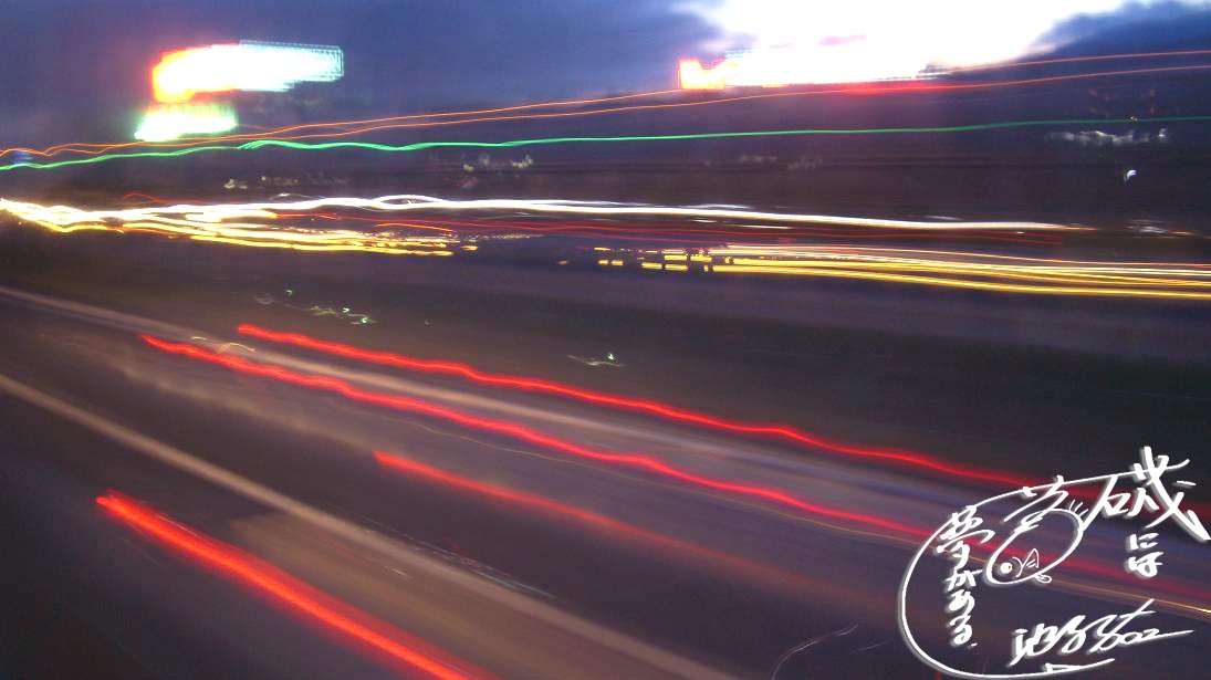 絵は、帰りのバスの中から九州道を撮ったもの。手前の4本の赤は、バスを追い越す普通車のテールランプ。黄色と白は対向車のライト、緑は大型車の速度ランプ?