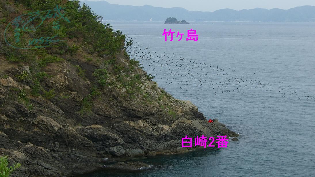 遠くに竹ケ島、すぐ傍には2番。そしてヒヨドリの大群が今、海を渡ろうと飛び立っている。