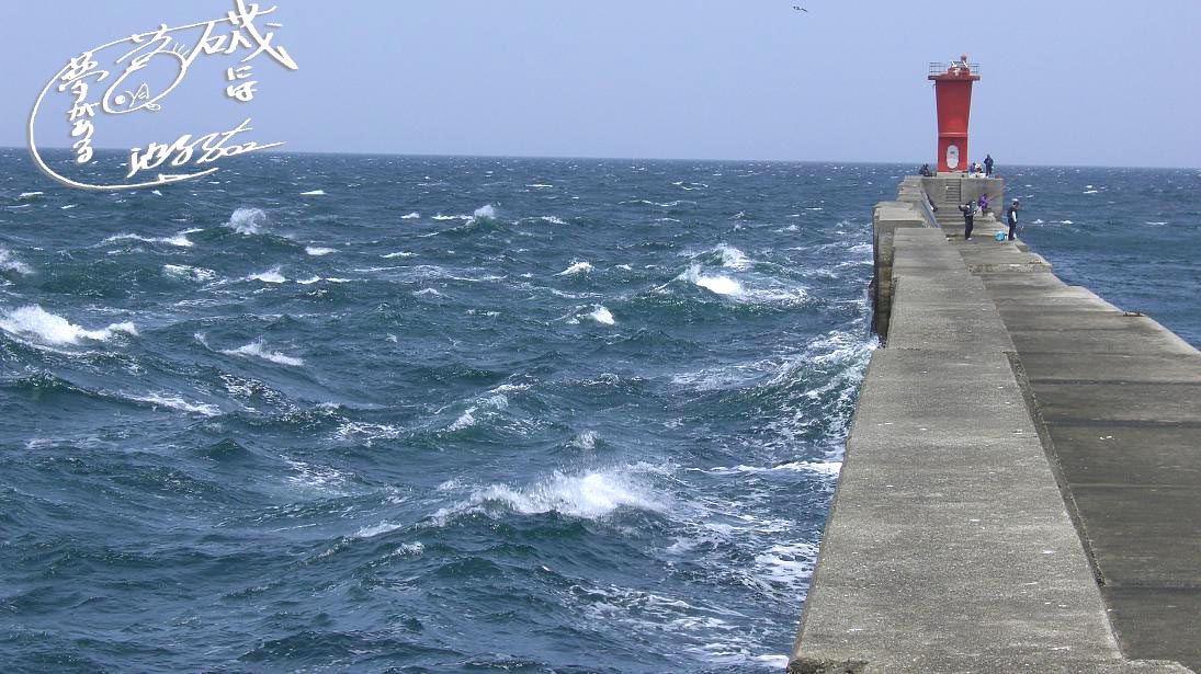 釣り座から先端の赤灯台を写す。この風波で満潮時だと飛沫が越える。