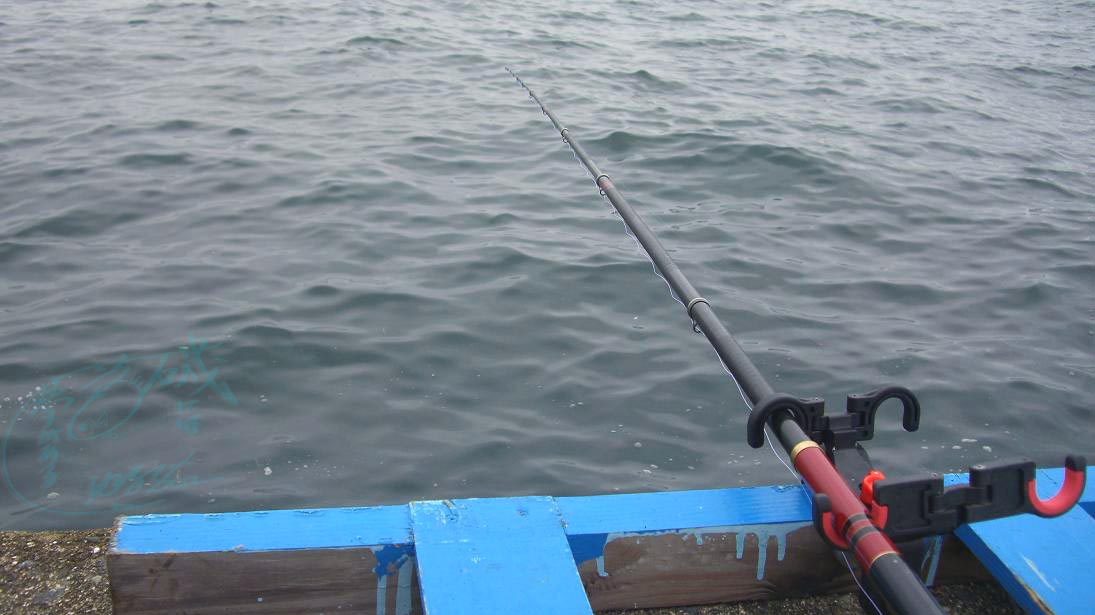 前回は置き竿でブリに竿を持って行かれたので、今回は竿受けを持参した。竿受けのセットはハシゴ。コレにセットして竿を取り付け、オープンベイルやドラグを緩めて竿を置く。