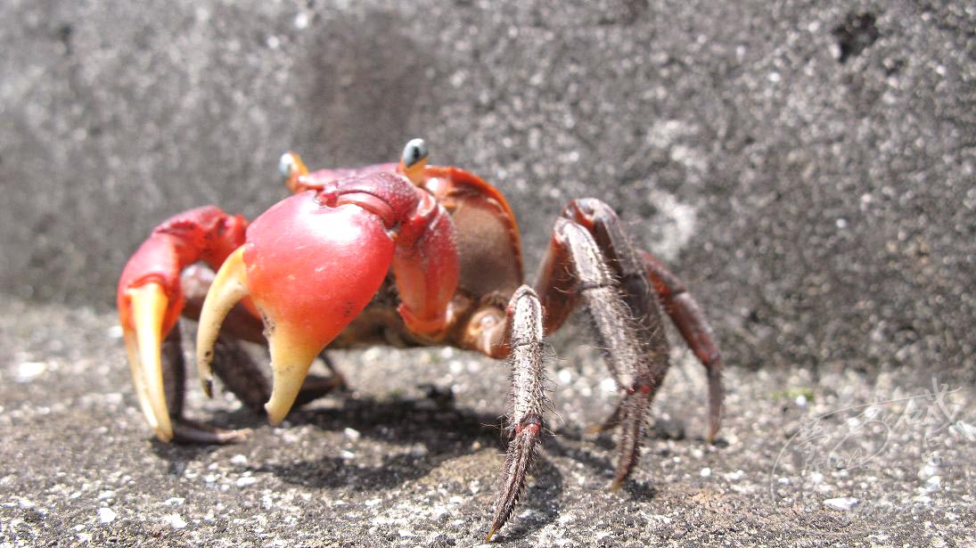 釣り場のコンクリートに点々と這っていた。日が昇って暑くなると、釣具の影で休んでいる。赤くて太く丈夫そうな爪が魅力的だけど、食用としてはあまり利用しない。今の時期だとカンダイのエサにもってこいかも・・・