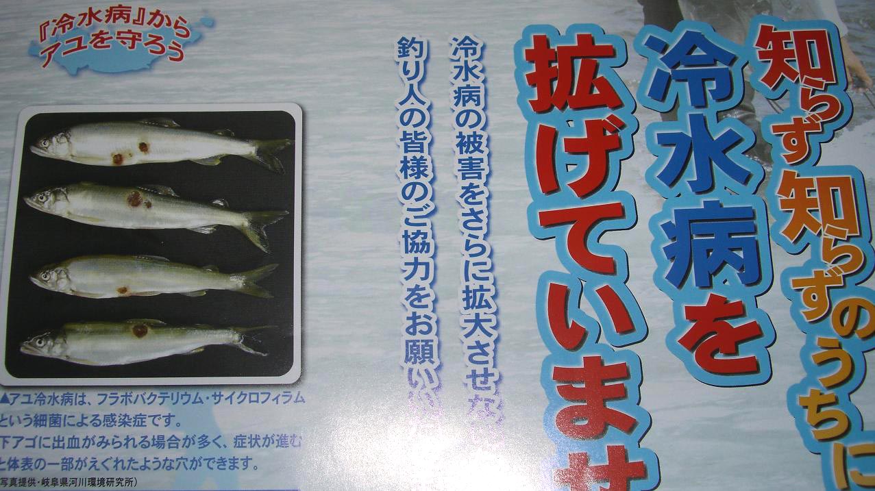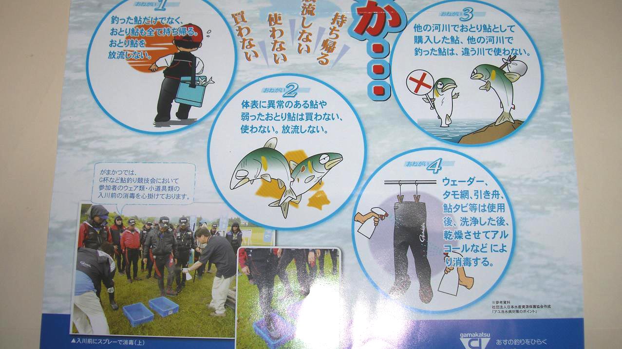 今ではほとんどの河川のアユに見られる様になった冷水病、色々な原因もあるけど、自分たちで実行出来る予防策をやっていく・・・そのPRパンフレットです。