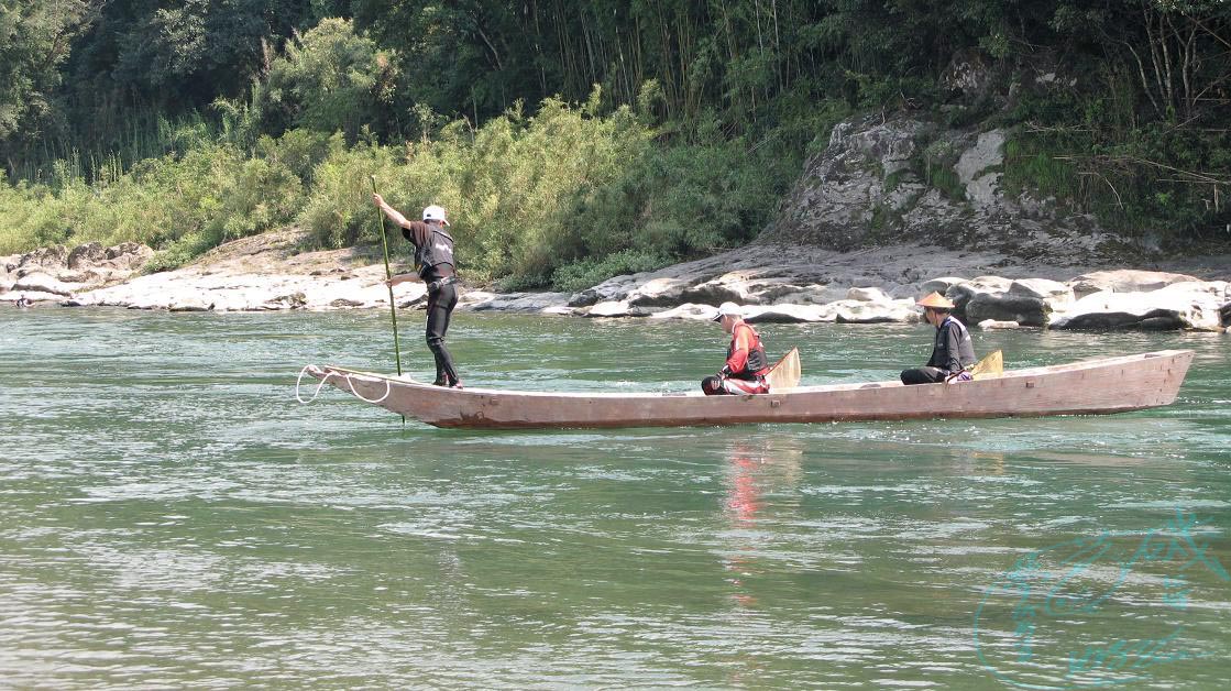 本来は網を入れてアユ漁をするための船だけど、今回は瀬渡し船?流石に船長の水竿捌きは一流品、浅いところは底を突いて、深いところは槐の様に漕いでいました。