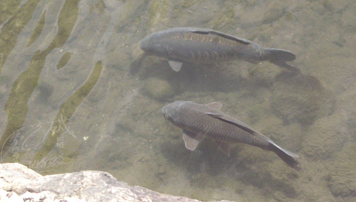 ・・・数匹のコイとカワムツ・フナなどがゆっくりと泳いでいます。何気に絵を撮っていると、一匹だけドイツゴイが混じっています。久しくドイツゴイを見なくなっていたけど、60cmくらいの立派なドイツゴイに見とれていました(^^♪