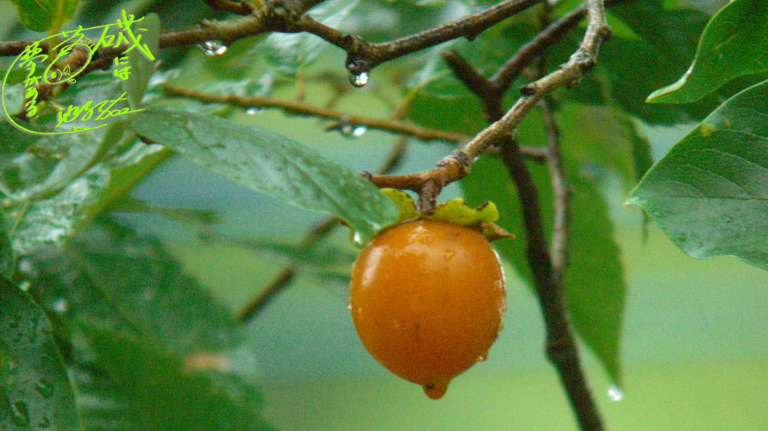 雨が降っているからしっとりしているけど、濡れている柿の木はとても滑り易いので『雨の日は柿の木には登るな』と親から強く習った記憶があります。