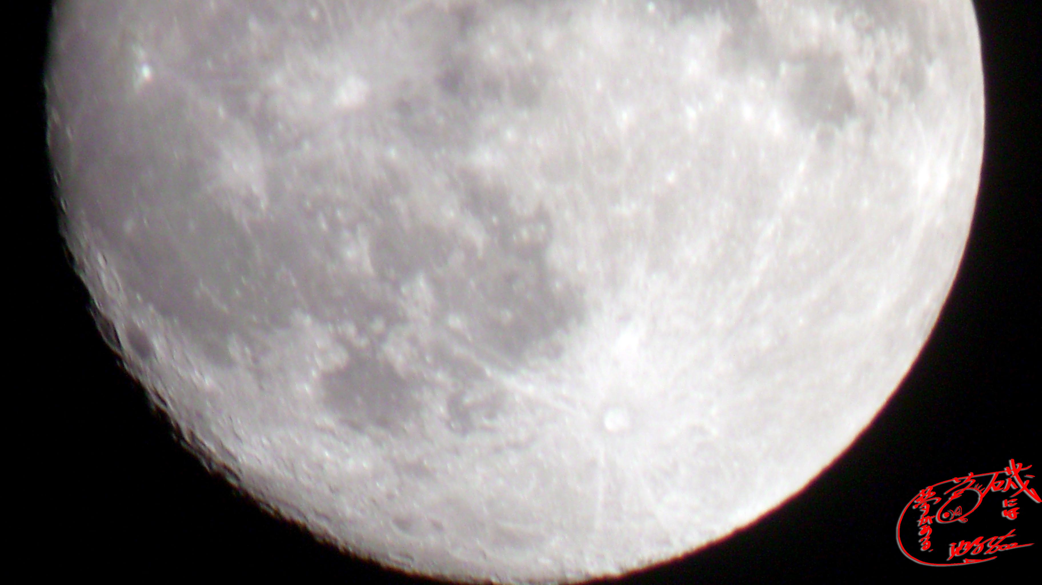 画像の上2枚は、これまで通りのサイズに縮めているので、ケータイからも見られますが、下の2枚は原寸大の写真なので、PCから見て下さい。いつもの通り、画像部分をクリックして最大まで拡大すれば月の直径は50cmと1mくらいになります。