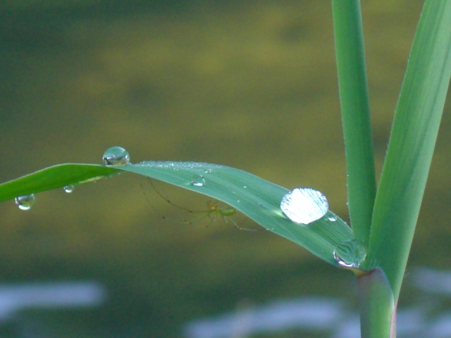 蔓アシの朝露がきれいだった(^^♪・・・蜘蛛も