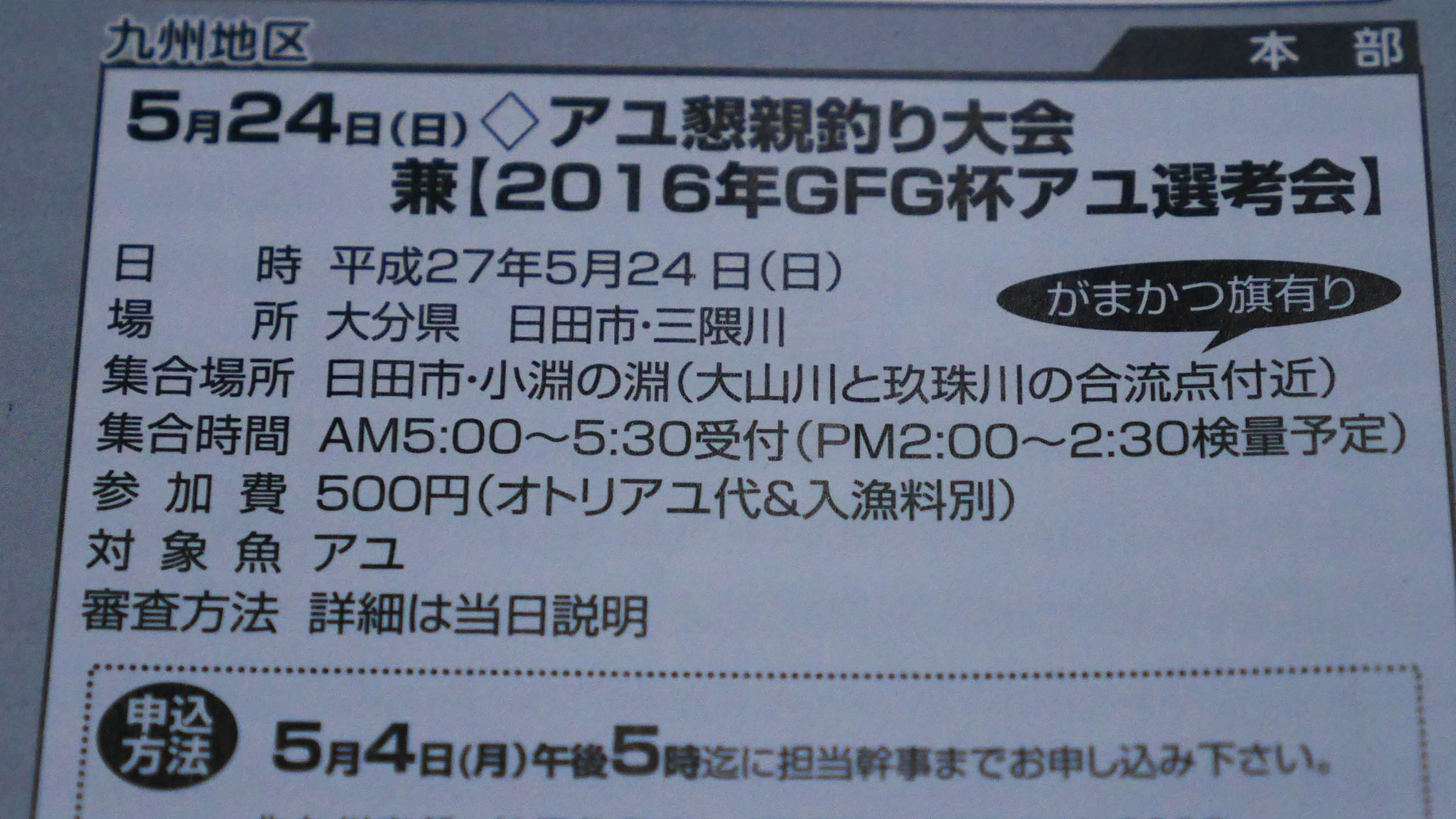 5月24日のアユ釣り大会、GFG大分の会員は私までご連絡下さい。