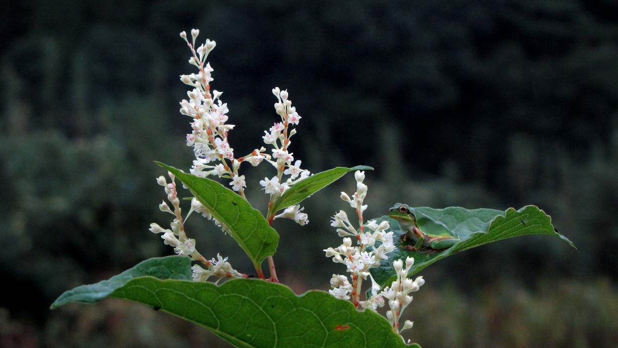 その中の一本に、花見をするニホンアマガエルが一匹居ました。