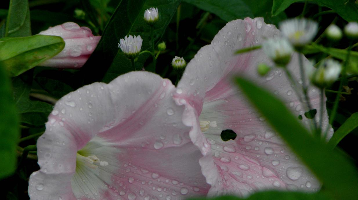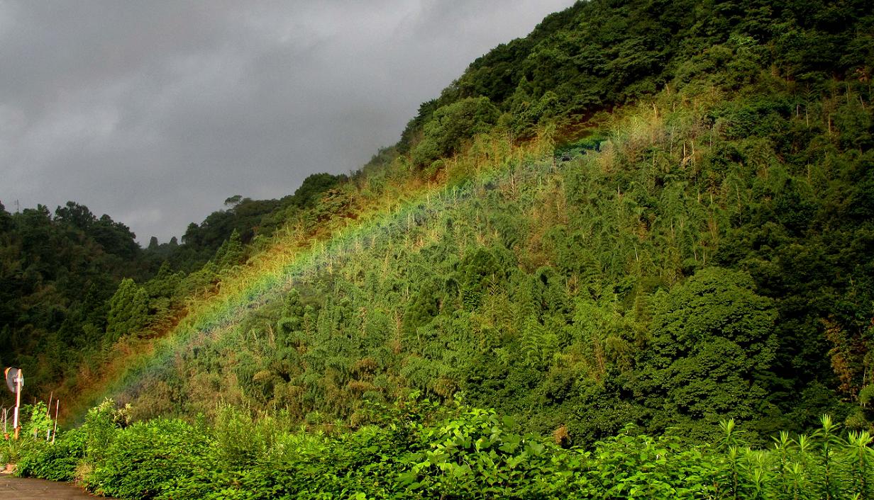 朝の七瀬川では近くに虹が出来ました。雲の間から覗いたお日様が雨粒を照らしたのは、ほんの数分です。なかなか上手く写せません。