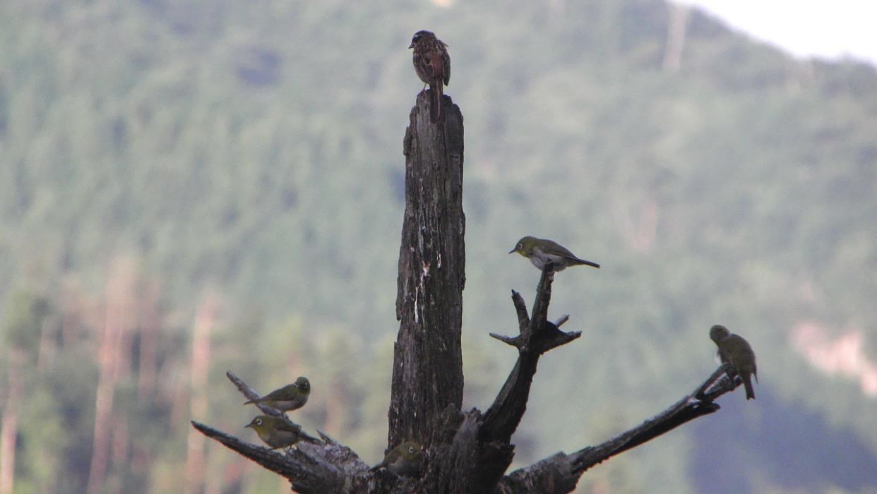 この松の枯れ木で近頃確認できた鳥達は、ハシブトガラス・オオタカ・キジバト・アオバト・オオアカゲラ・アオゲラ・コゲラ・ヒヨドリ・オオルリ・ソウシチョウ・ヤマガラ・ホオジロ・メジロなどです。写せていないのは、ハシブトガラスとオオアカゲラだけ、本命はオオアカゲラなのですが・・・