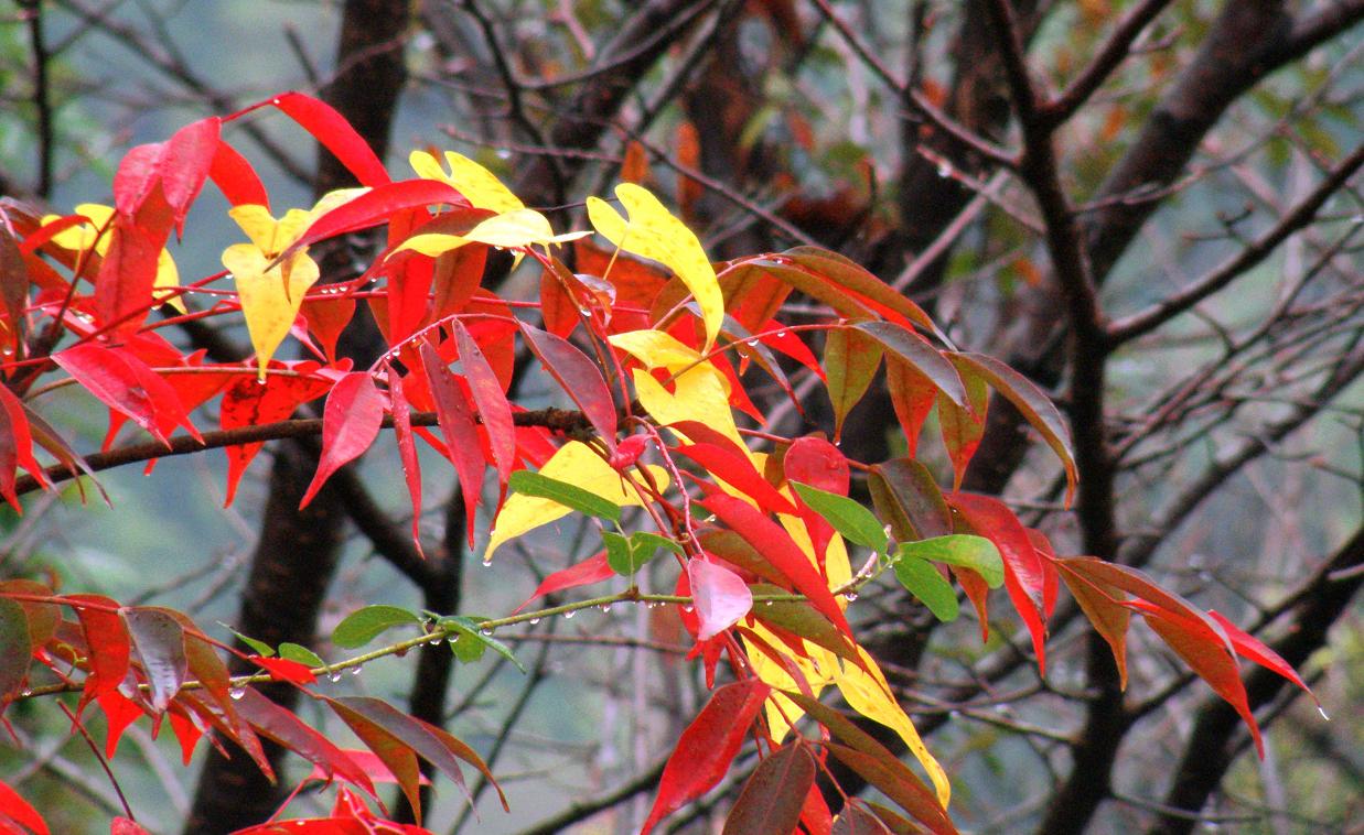 手前はミツバツツジ、その奥にモミジの赤とトコロの黄色です