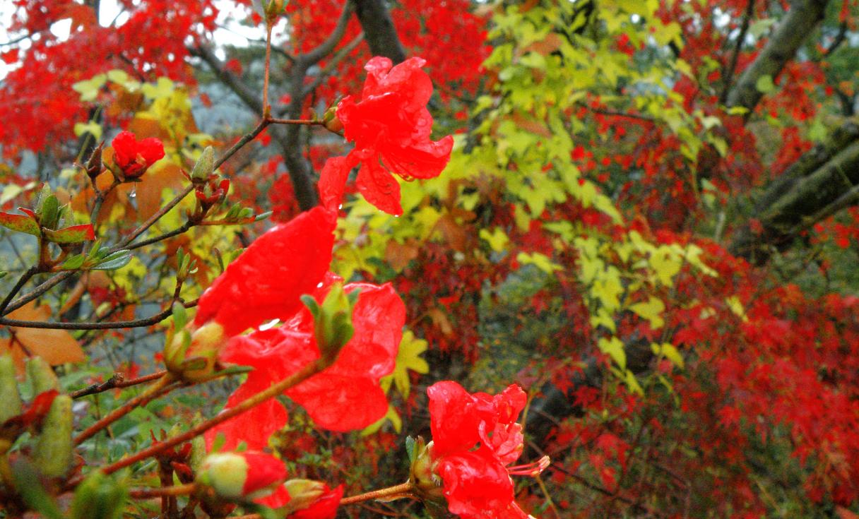 あちらこちらで紅葉も始まっている中、ミツバツツジも花をつけていました。本来は春に花が咲くのですが・・・