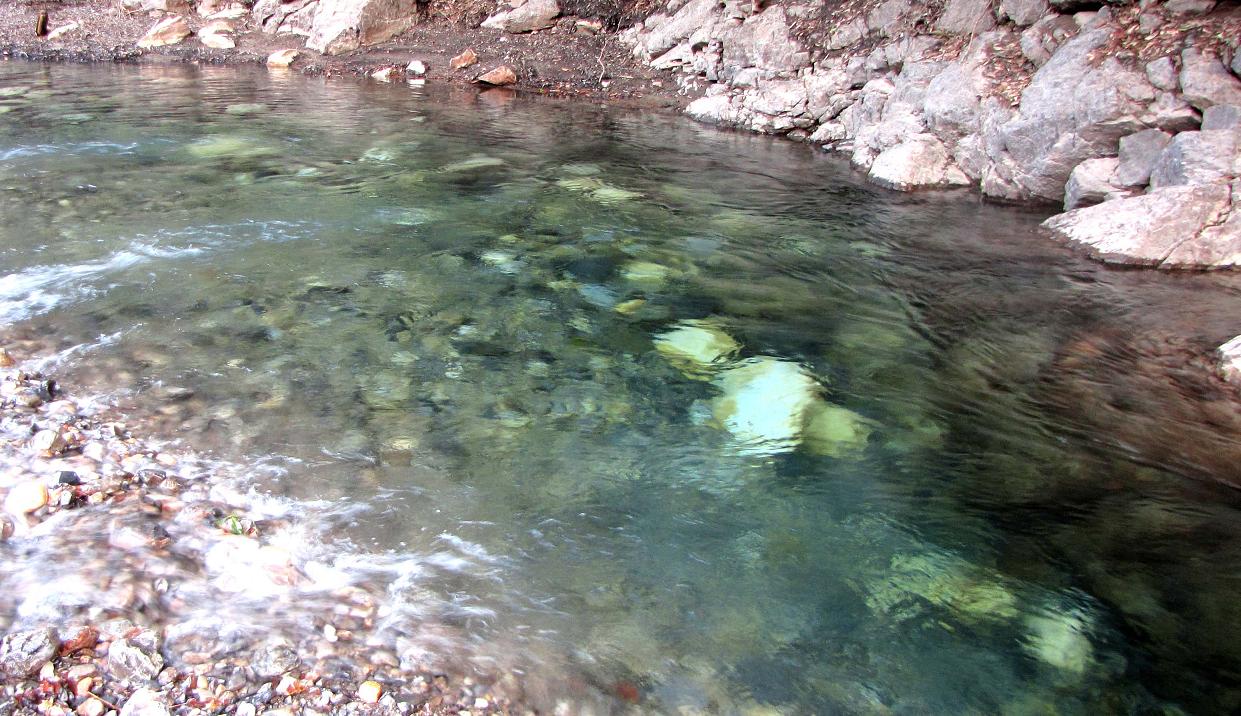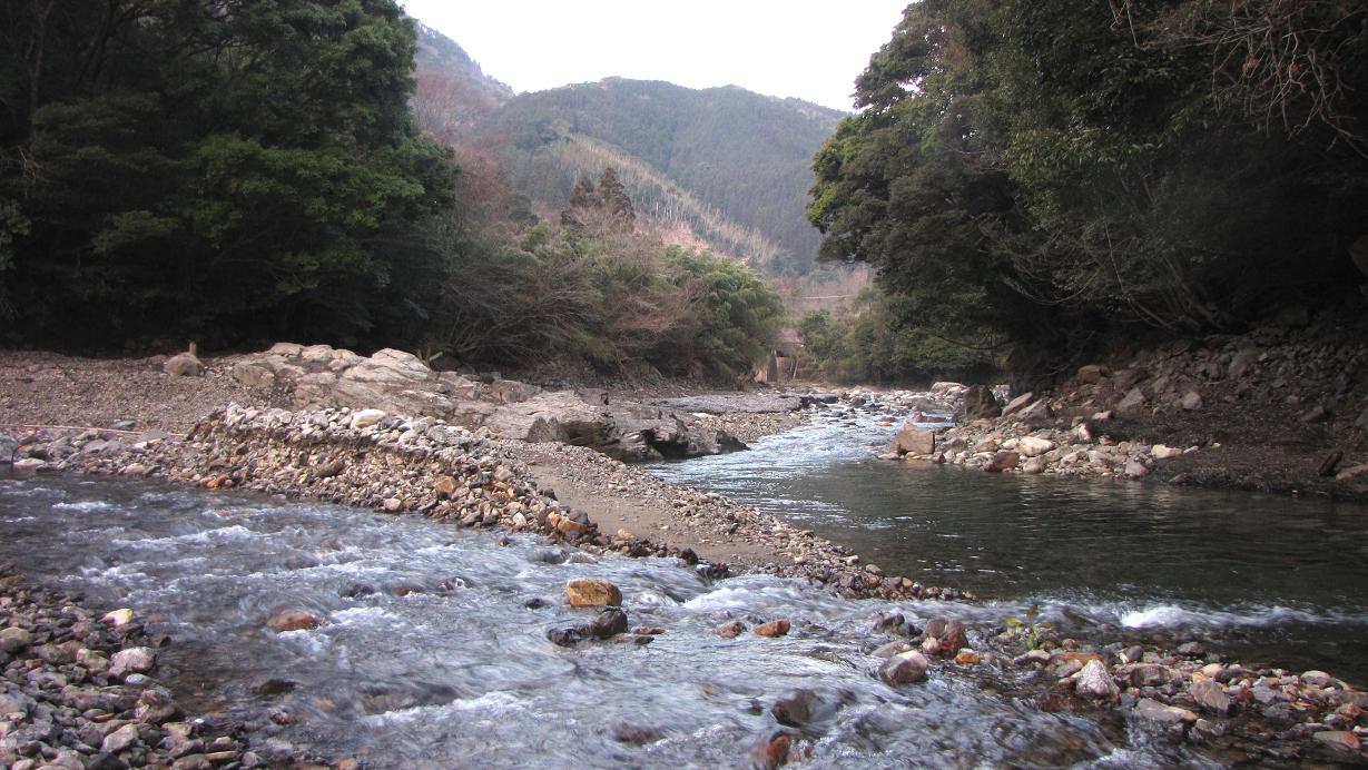 同じ湖底から上流側です。普段は水面下の石や砂です