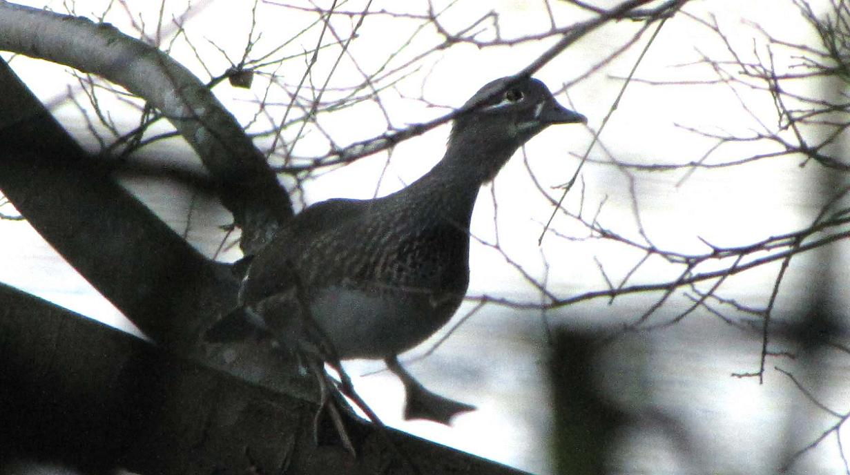大分市内のオシドリ♀です。一羽だけ観察ポイント側の木に留まりました