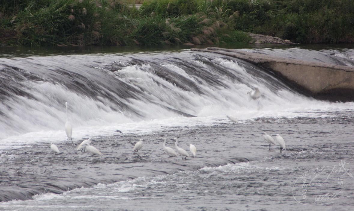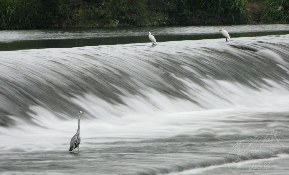 手前はアオサギ、遠くの2羽はコサギ、獲物を待つ時には静止している習性を利用して、川の流れと供に写したら、静と動が上手く融合した絵になりました。