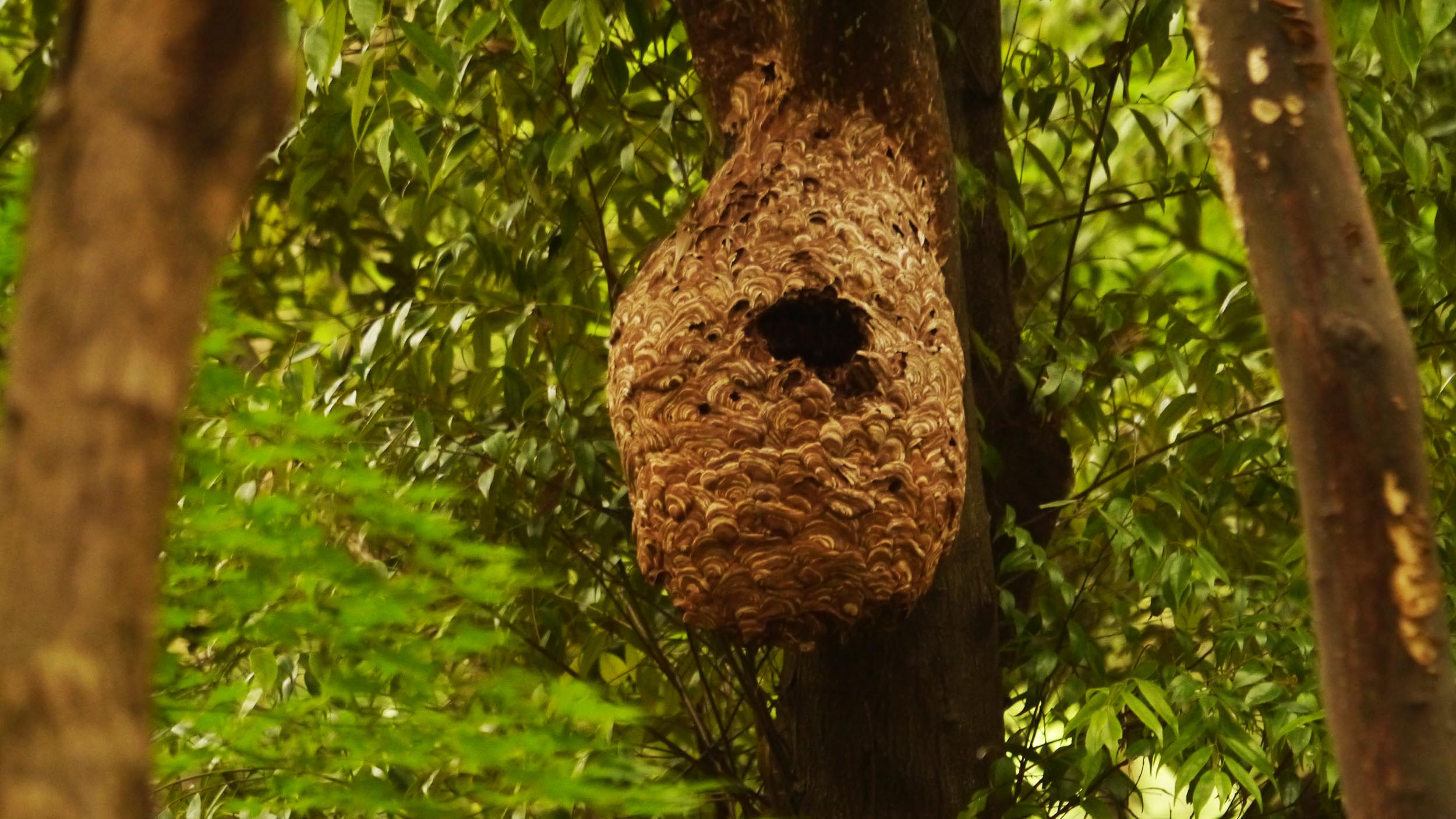 少し時間があったので、一緒に山へ入りました。池田さんは花に詳しいから、色々と教わりながらキョロキョロしていると・・・比較的大きな木の5~6m上にハチの巣がありました。そのハチの巣には大きな穴が開けられています。