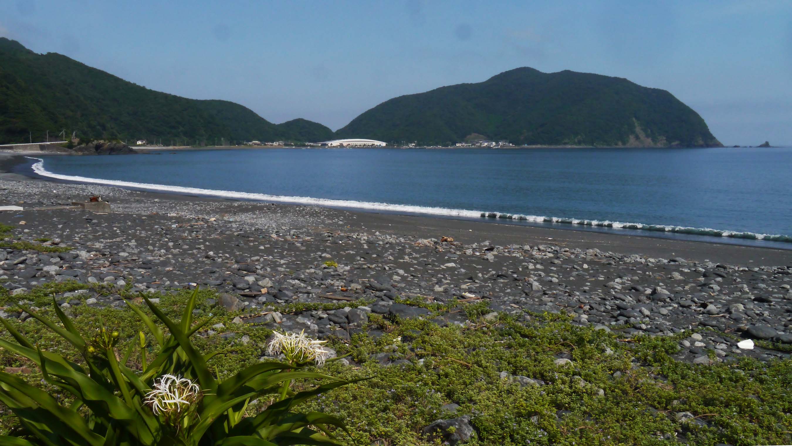 佐伯市米水津の間越(はざこ)海岸。遠景に"なずなの塩”工場