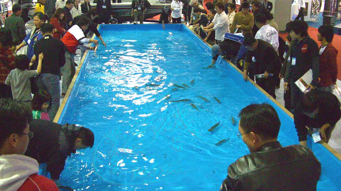 Fショーも終わりに近づいた午後4時、がまかつのブース前に有るプールに人だかリが出来た。