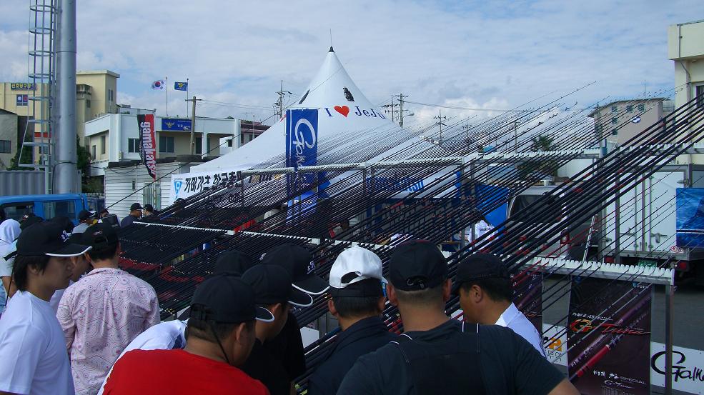 済州島のソギホで開催された大会では、みんなが磯に渡った後、大会本部の横にがまかつの主な竿を展示した。