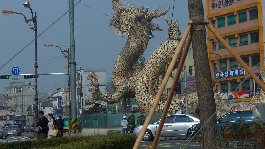 こんな大きな龍のモニュメントを見つけ、移動中の車の中から絵に収めた。竹で編んでいると思う。
