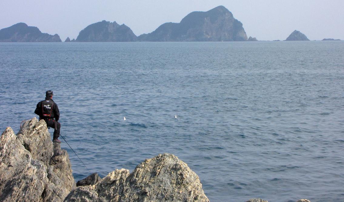 この場所は港から出て10分も掛からないでしょう。沖から見て一番左のハナレが棹立てバエで、その右に二つの岩場が突き出ており、今回は右側(北)の足場の悪い方での釣りです。