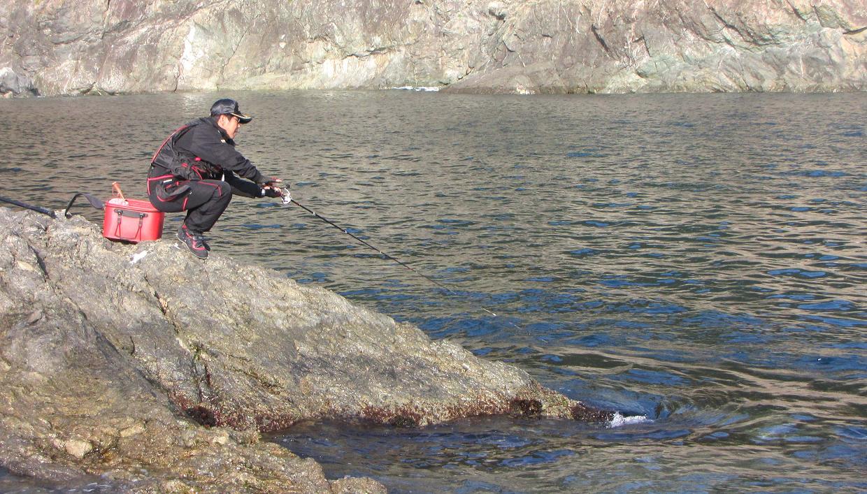 狙いは寒グレです。九州の釣り雑誌“釣ファン”の八反田さんとの3人で、米水津の長崎鼻の北側に7時30分ごろ上礁しました。