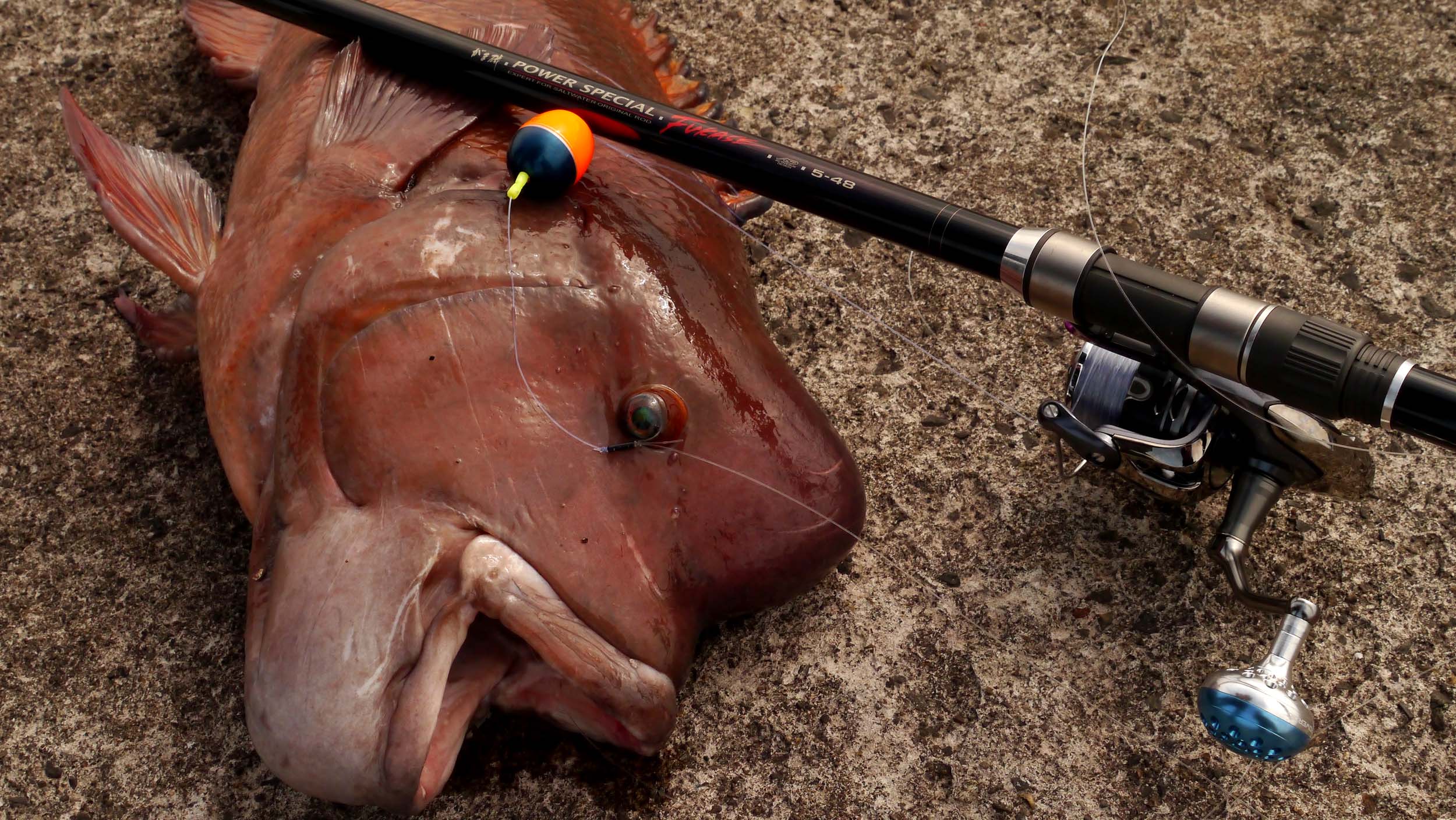ヤワな4号竿や4000番のリールの足が折れて吹っ飛びます。