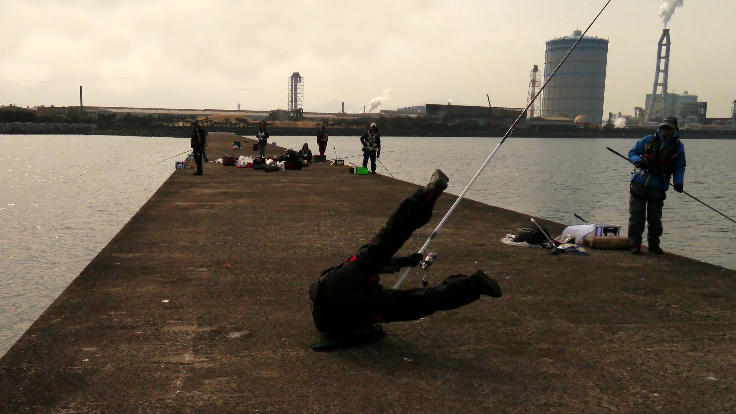 魚が沖に走る時、ハリスが切れると釣り人は後方に吹っ飛びます。